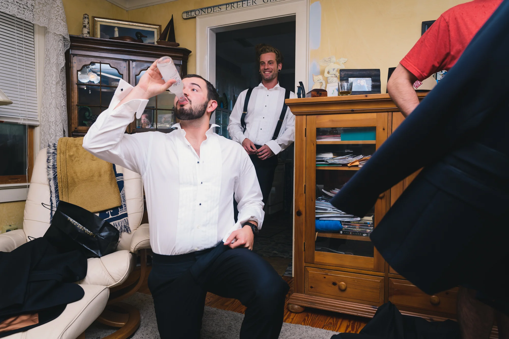 Men in dress shirts preparing for an event, one kneeling and drinking from a bottle, another smiling in the background, and a wardrobe filled with items.