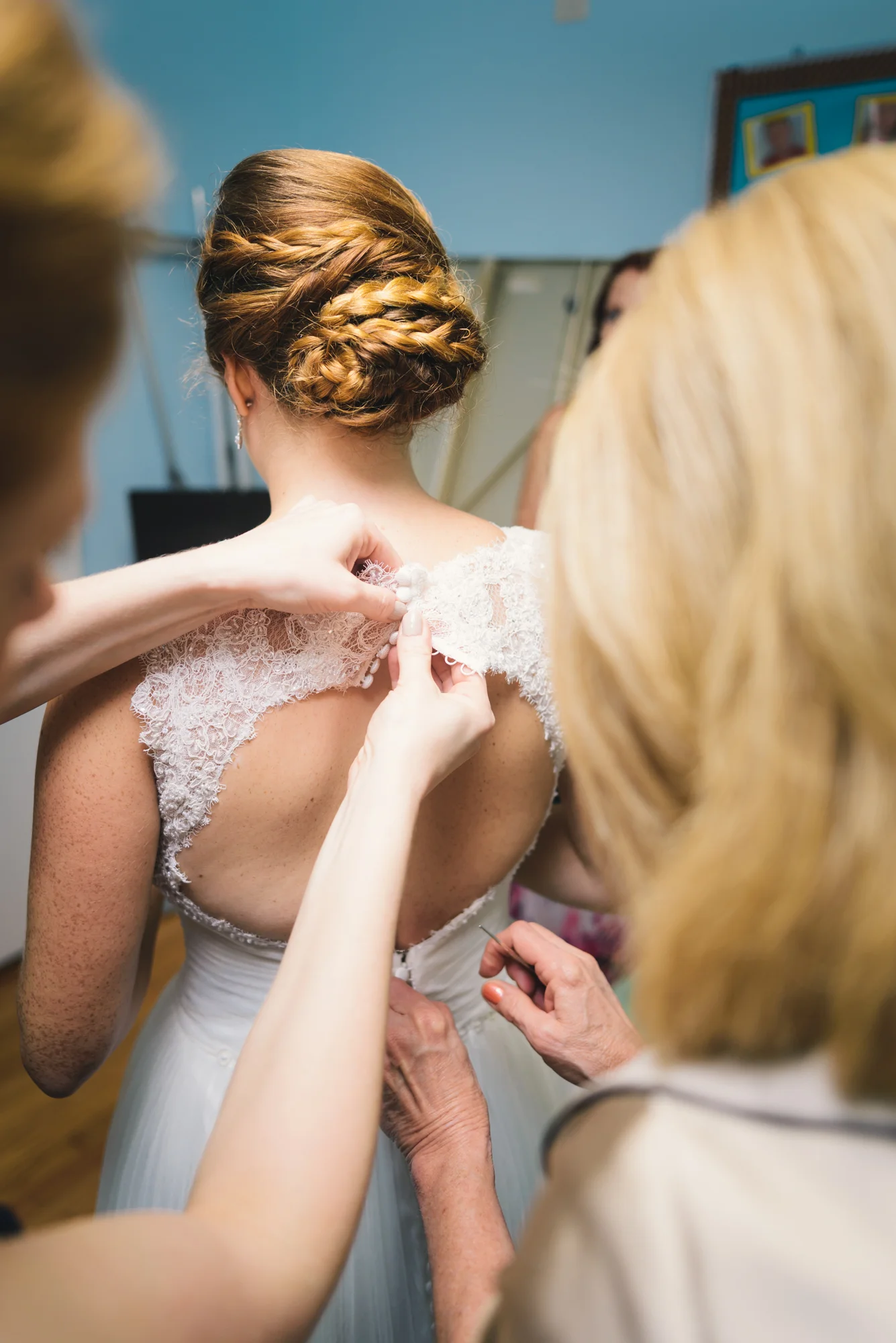 A bride with braided updo having her wedding dress buttoned by others. View fullsize