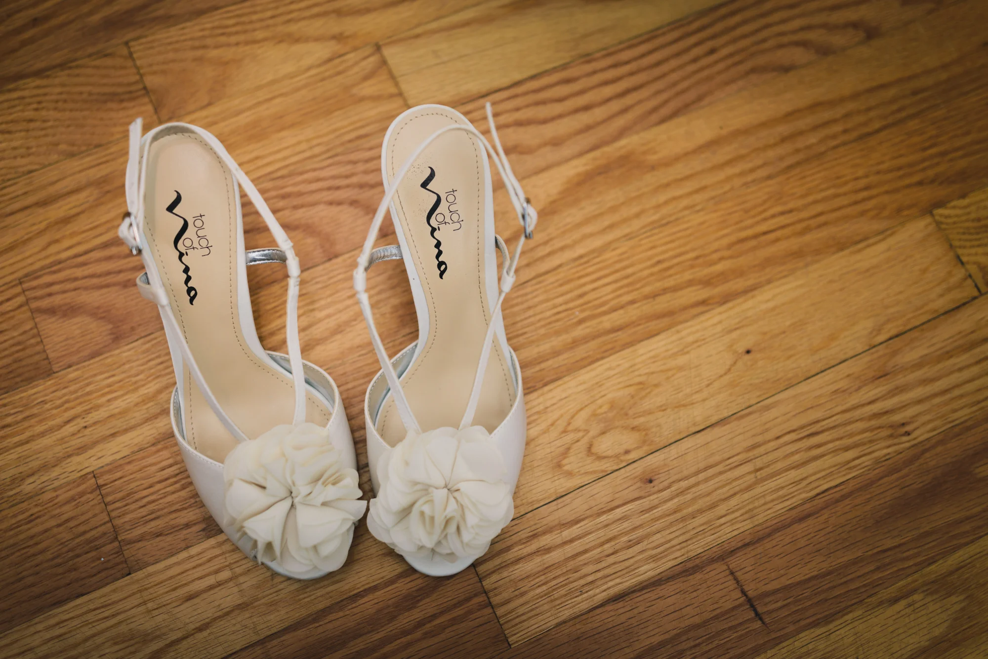 Pair of white high-heeled sandals with floral decorations on wooden floor.
