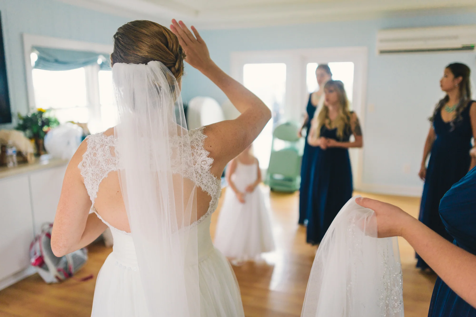 Bride in white wedding dress with veil adjusting her hair, surrounded by bridesmaids in dark blue dresses, standing in a bright room.