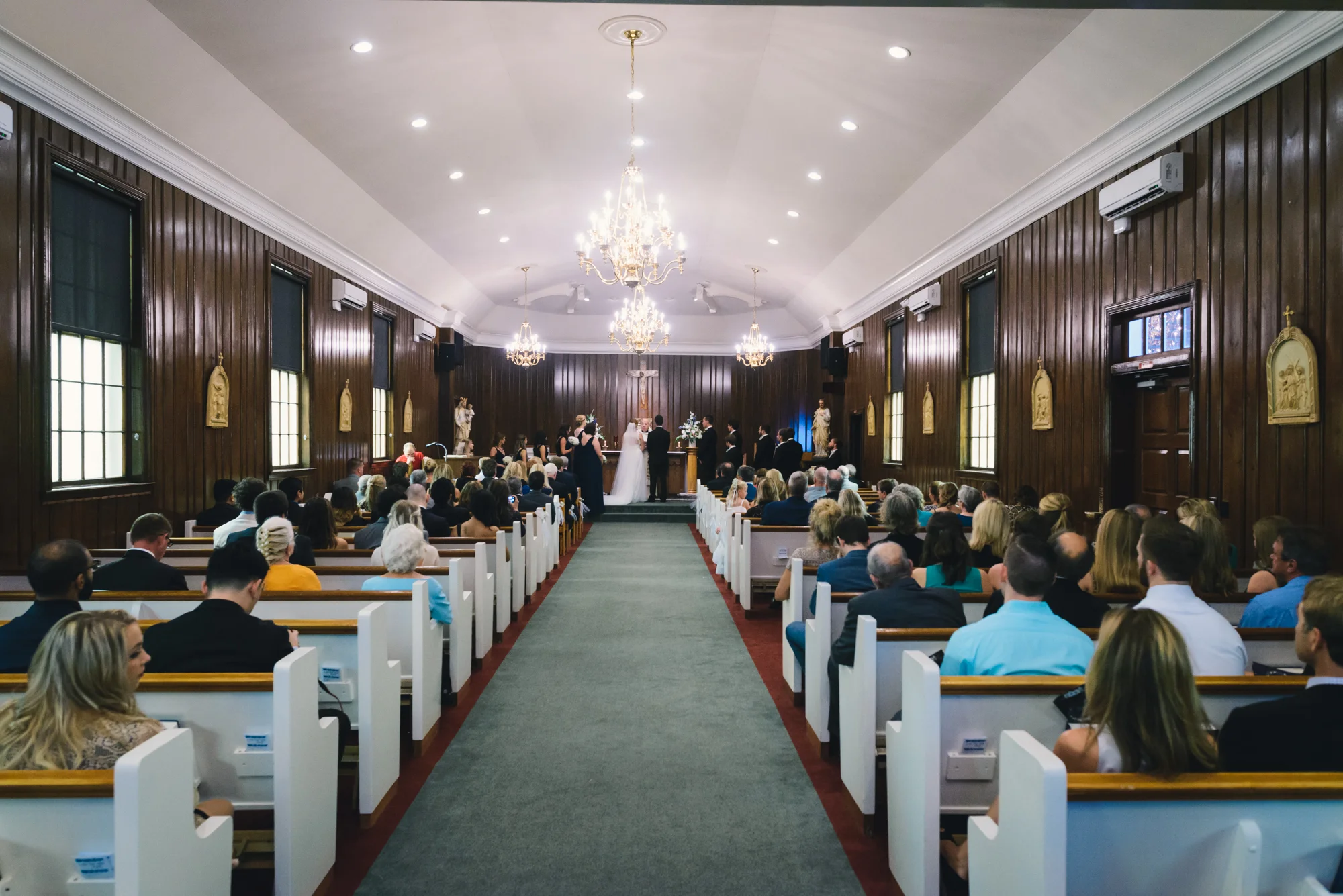 A wedding ceremony in a church with wooden walls and chandeliers, featuring a bride and groom at the altar and guests seated in pews.