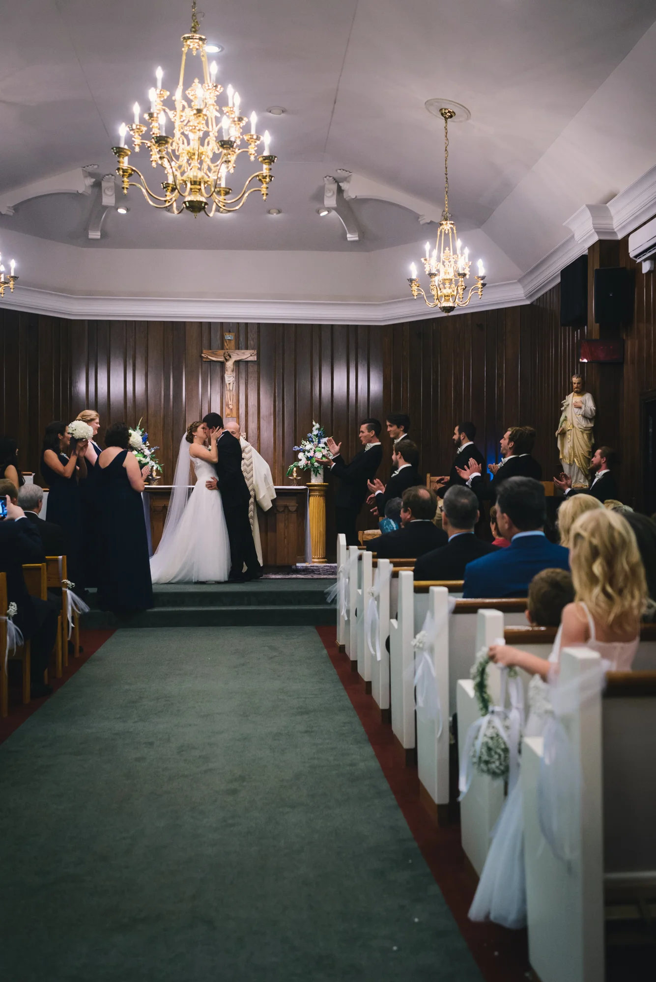 Bride and groom kissing in a church setting with floral arrangement and religious iconography in background. View fullsize