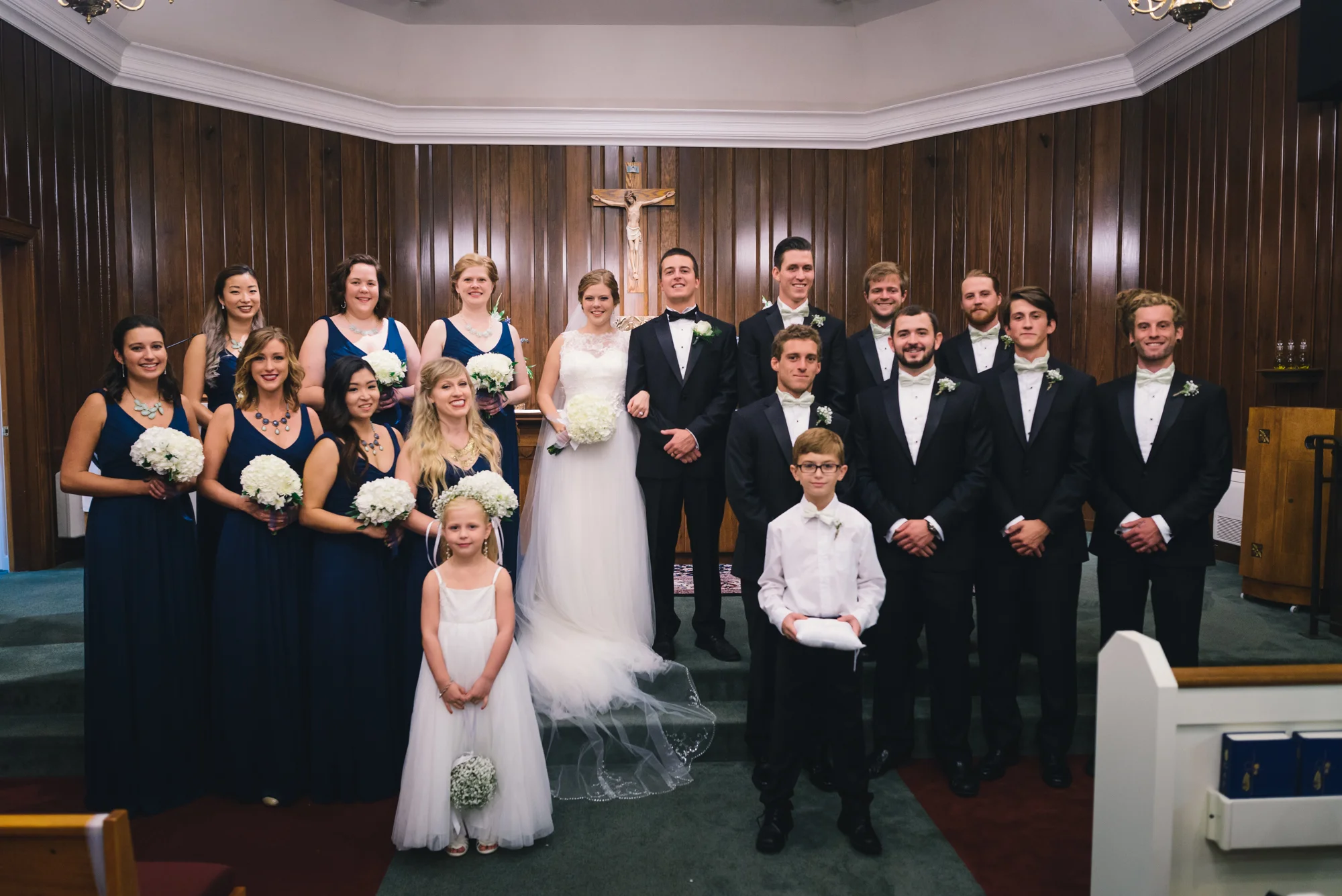 Wedding party posing indoors in formal attire, including bridesmaids in blue dresses, groomsmen in black suits, a bride in a white gown, and a groom in a tuxedo, with a flower girl and ring bearer.