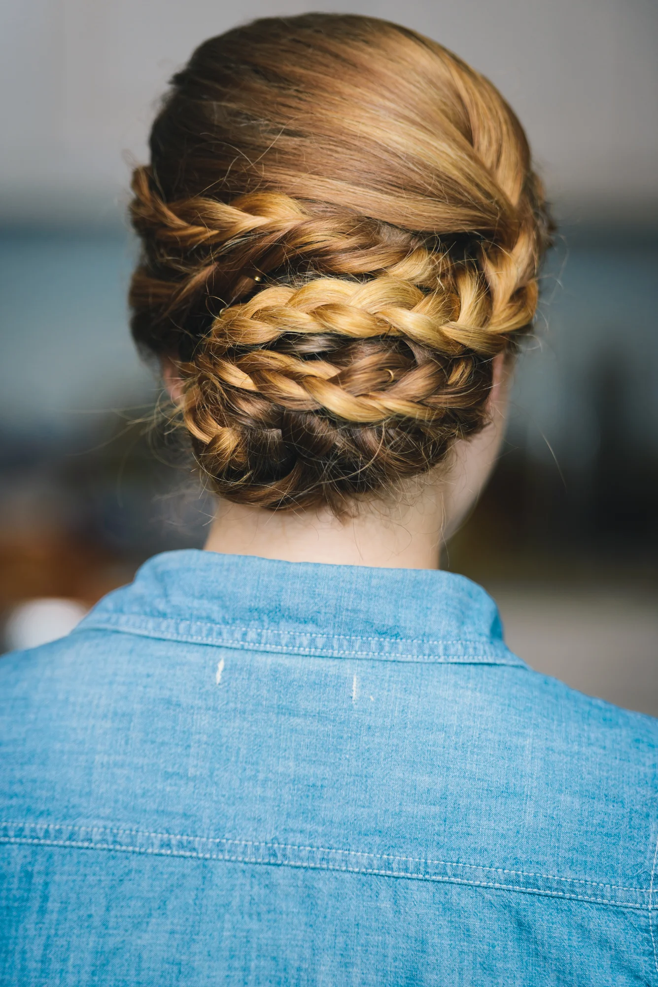 Woman with braided updo hairstyle wearing a denim shirt, viewed from behind.
