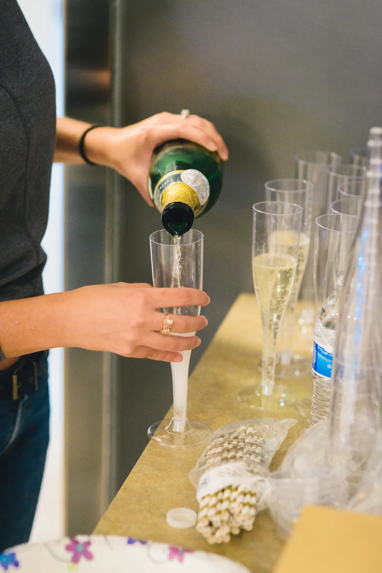 Person pouring sparkling wine into a plastic champagne flute with several empty flutes and a water bottle nearby. View fullsize