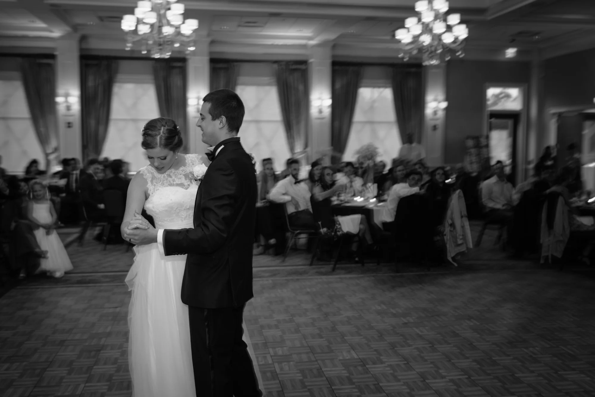 Bride and groom dancing at a wedding reception in a banquet hall with guests seated at tables.