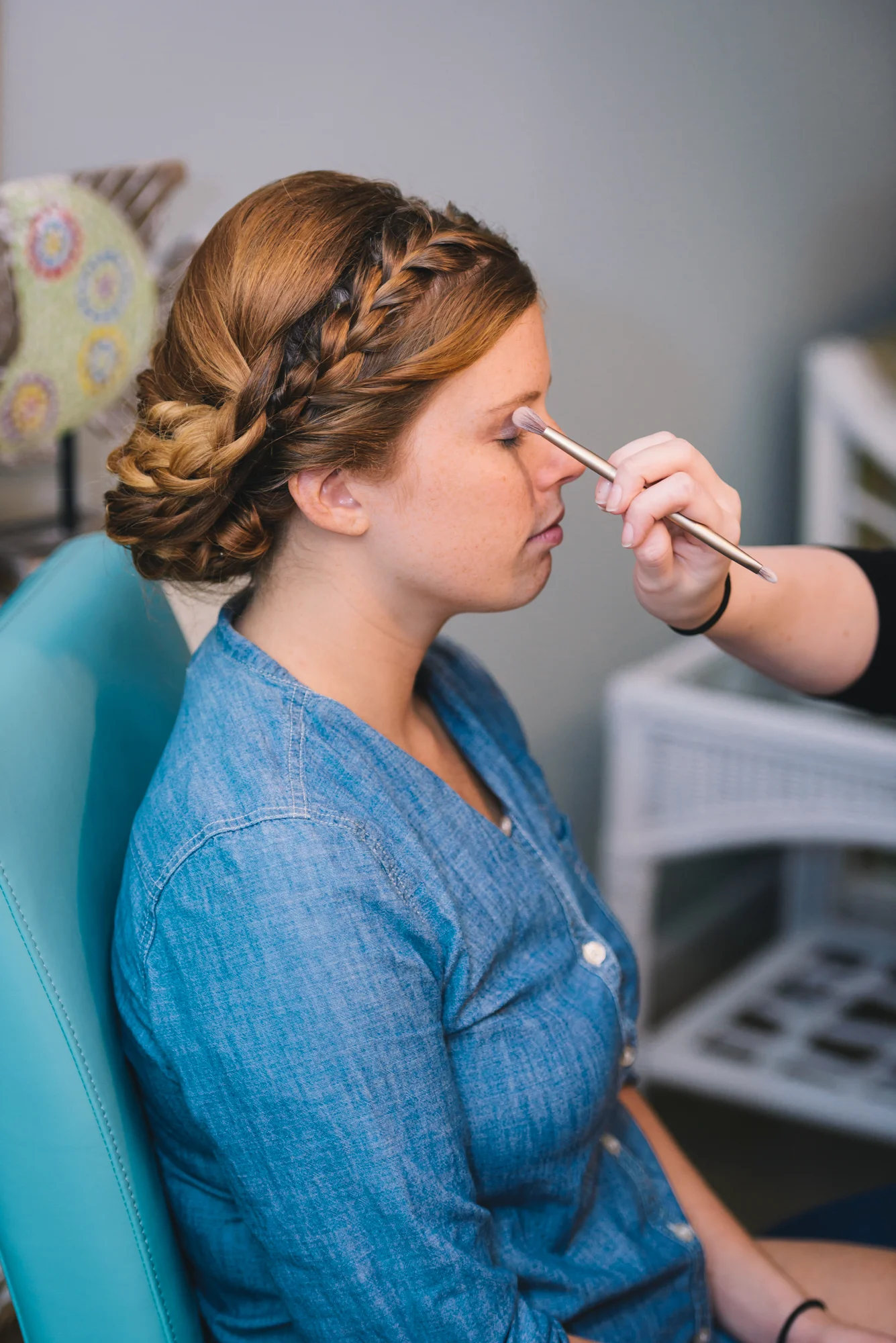 Person sitting in a chair receiving makeup application on eyelids, wearing a blue denim shirt and braided hairstyle. View fullsize