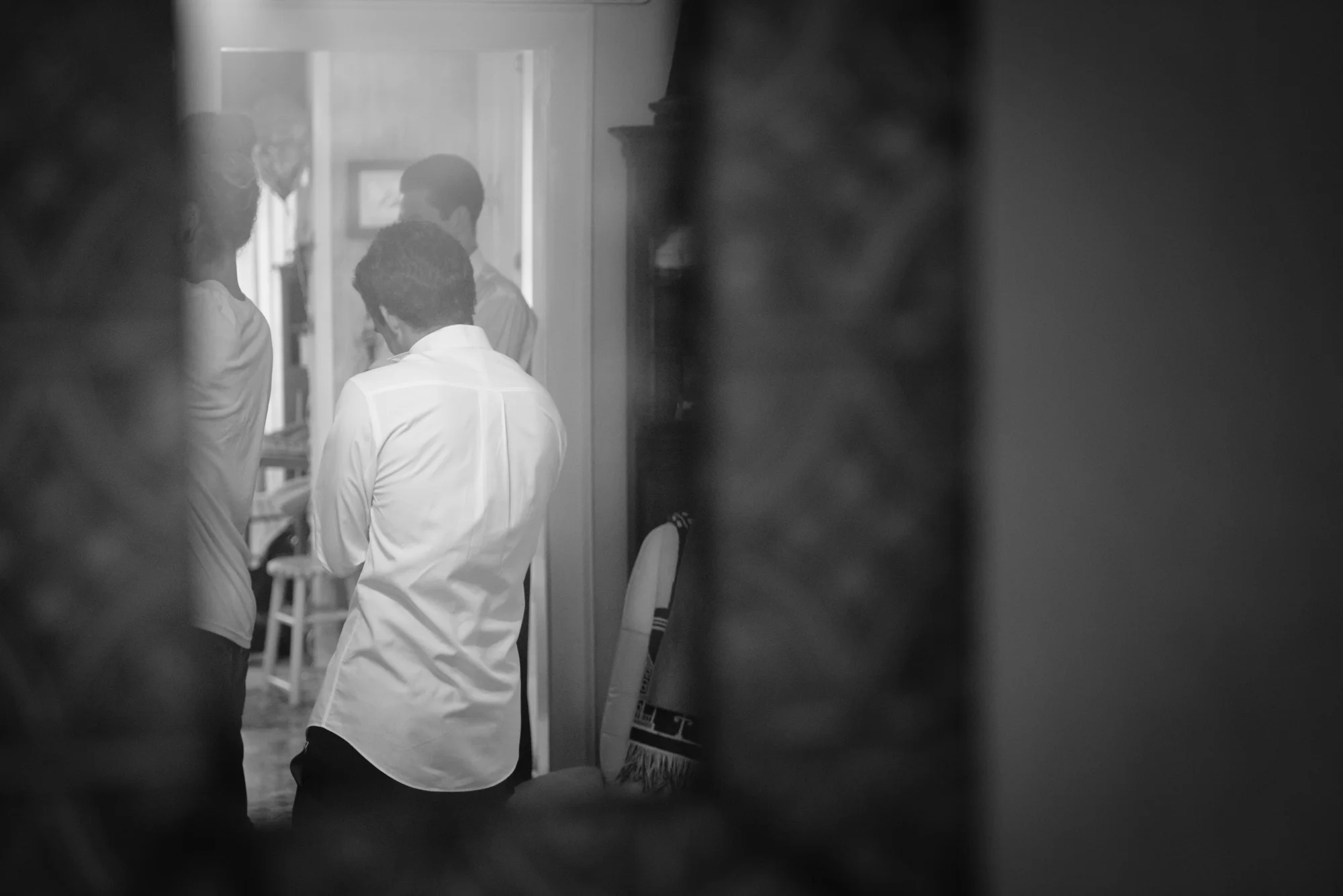 Three men wearing formal white shirts with black suspenders, preparing for an event in a living room with a casual setting. They are adjusting their clothing, one holding a tie. The room has a cozy appearance with colorful blankets and paintings on t