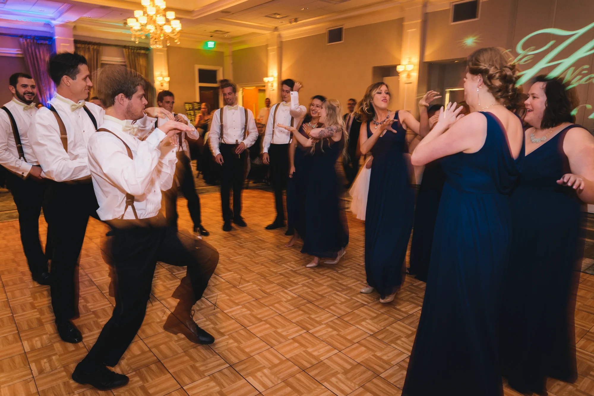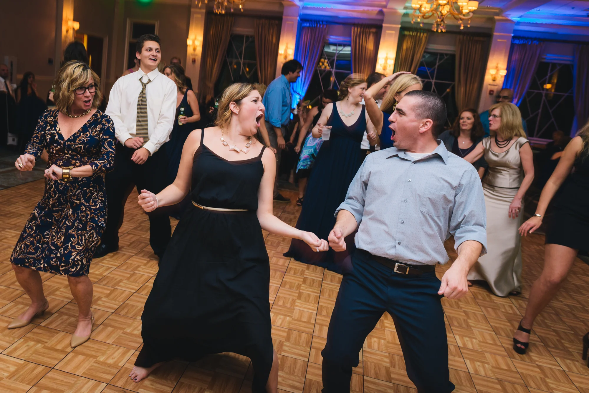 People dancing energetically at a formal party on a wooden dance floor, with a well-dressed crowd in the background.
