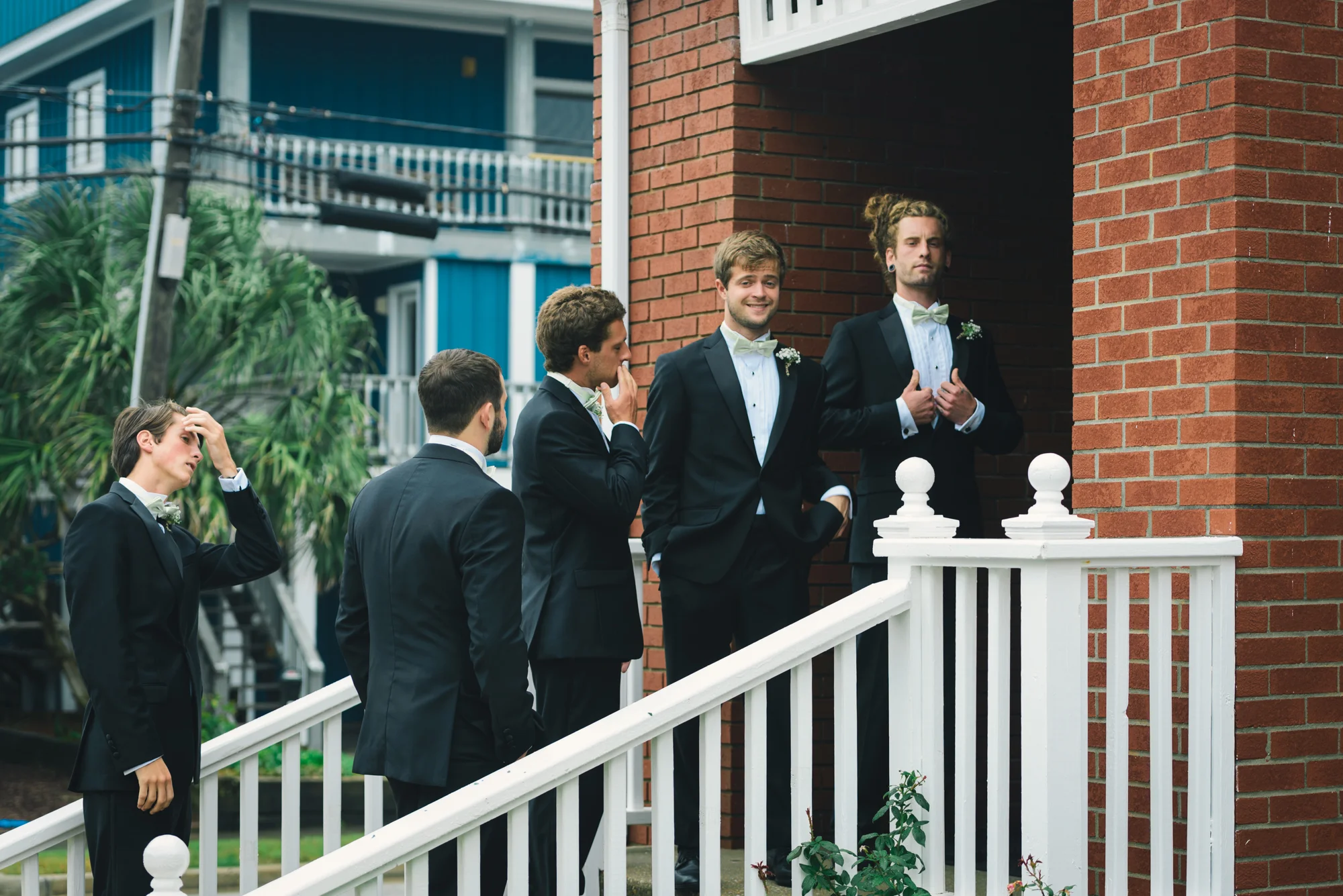 Group of men in suits standing on porch steps, wearing matching tuxedos, corsages, and bow ties.