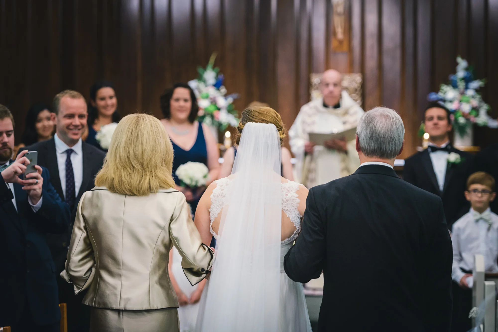 Bride walking down the aisle with parents at a wedding ceremony, priest and guests in background.