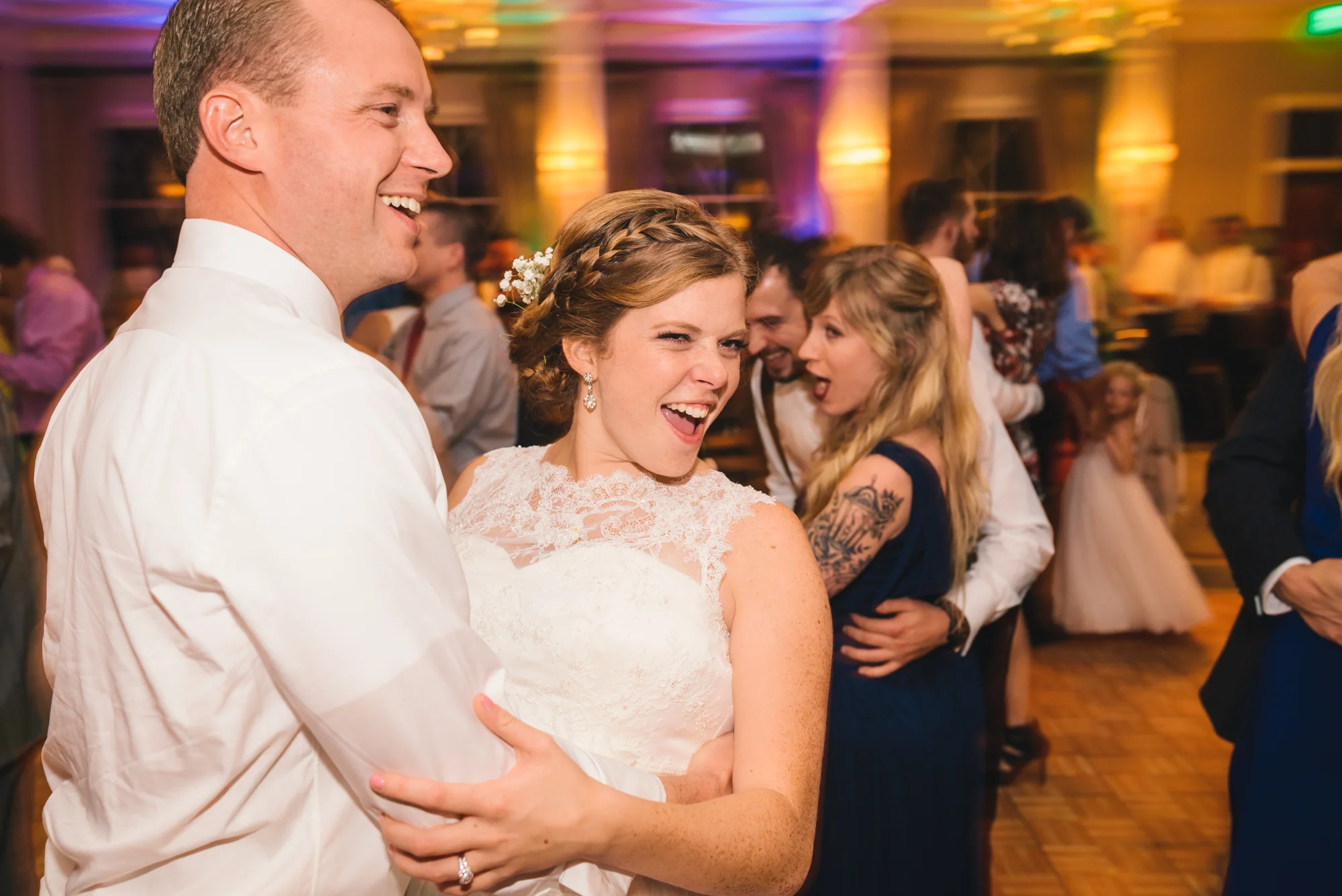 Bride and groom dancing at wedding reception with smiling guests in the background. View fullsize