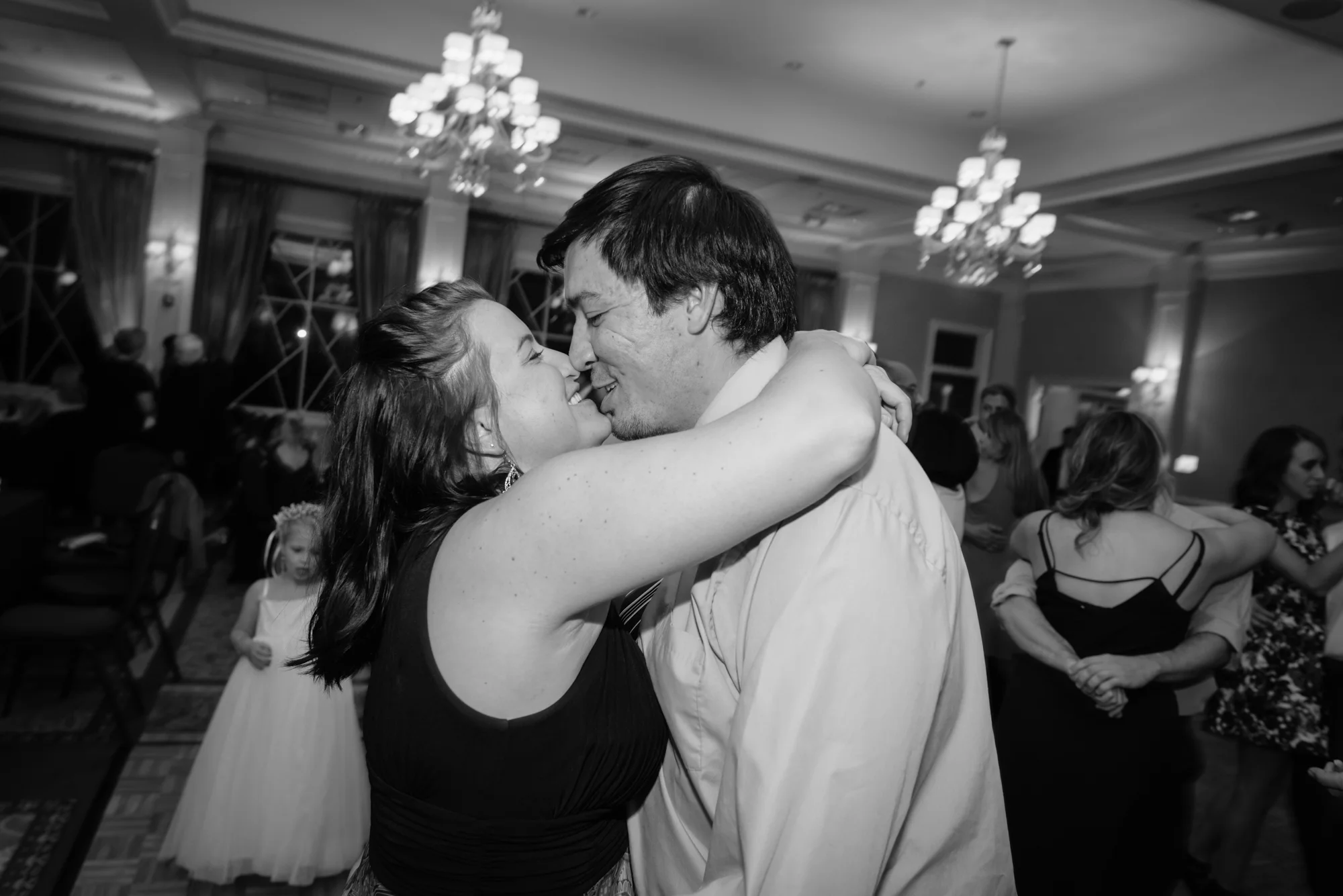 A couple embracing closely on a dance floor at an indoor event, possibly a wedding, with a girl in a white dress and other attendees in the background. The room features chandeliers and draped windows. View fullsize