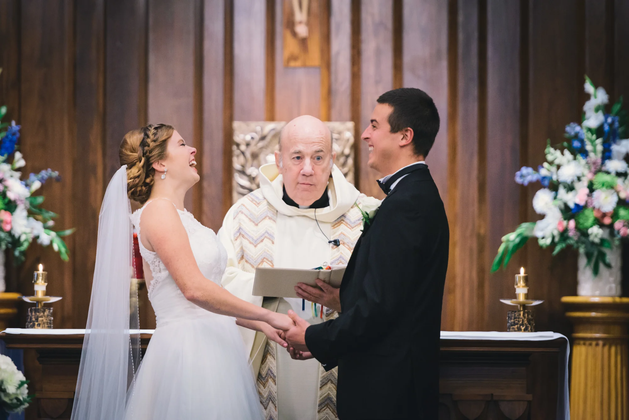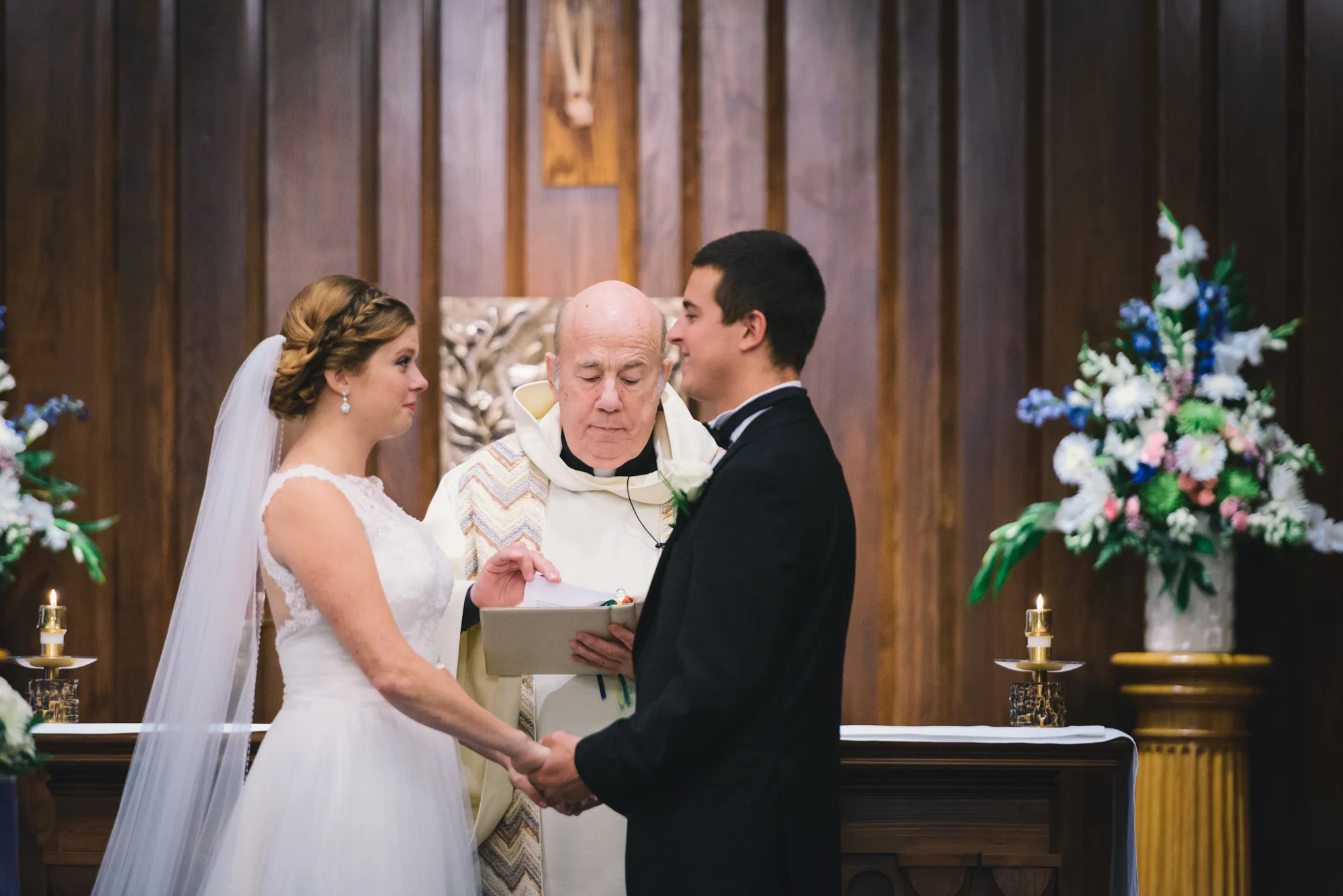 Bride and groom holding hands during a wedding ceremony officiated by a priest in a church.