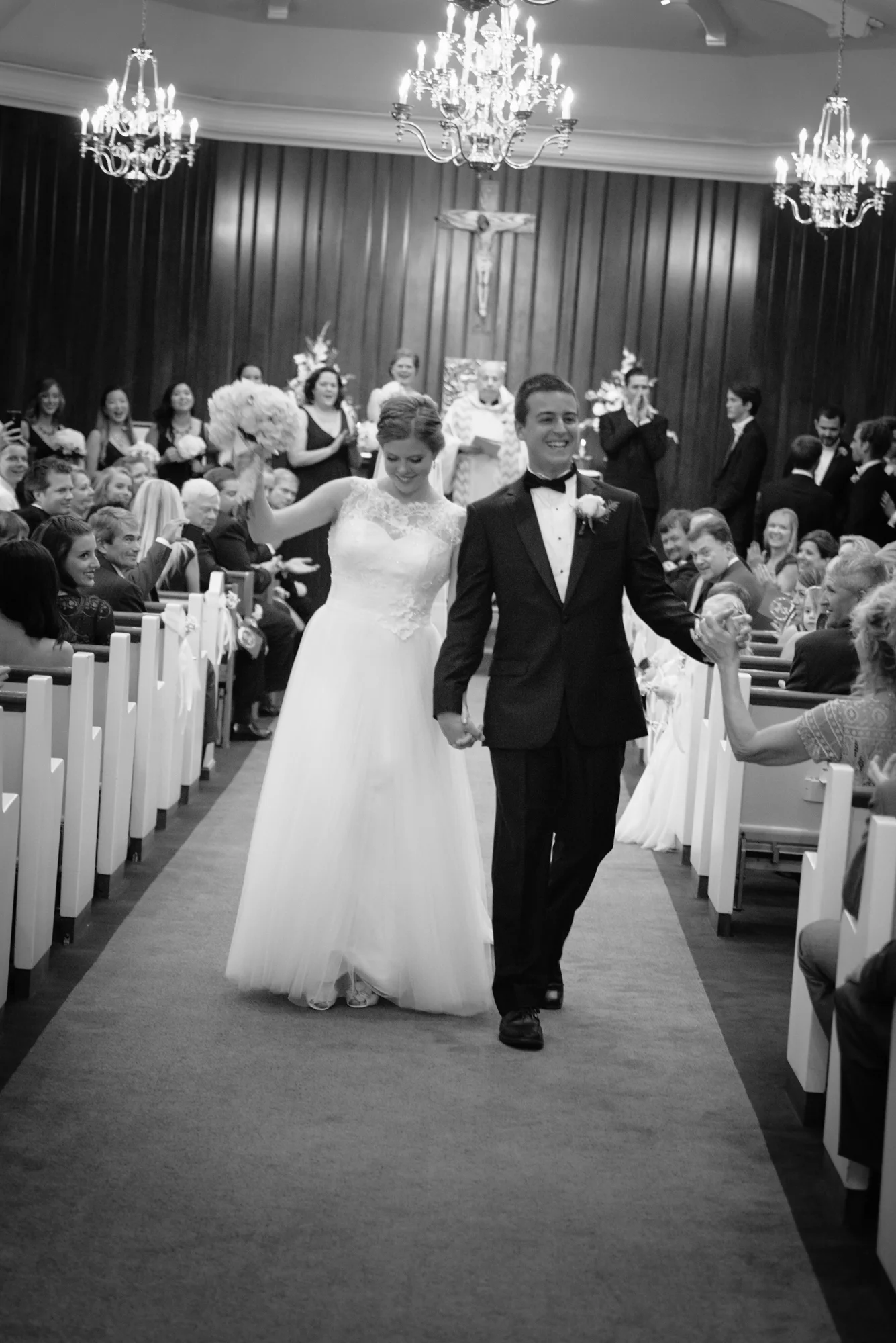 Bride and groom walking down the aisle in a church, guests clapping and cheering.