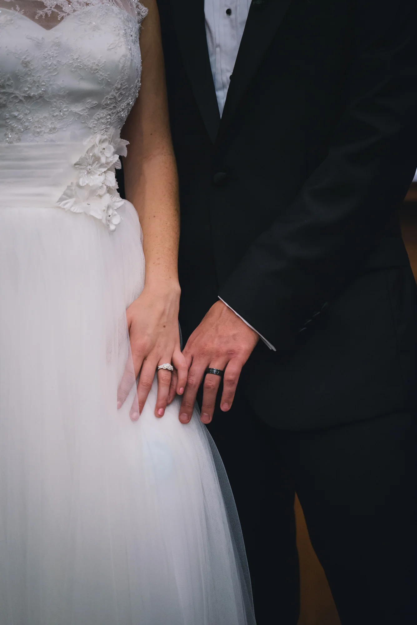 Bride and groom holding hands, showcasing wedding rings. Bride wearing a white lace wedding dress, groom in a black tuxedo.