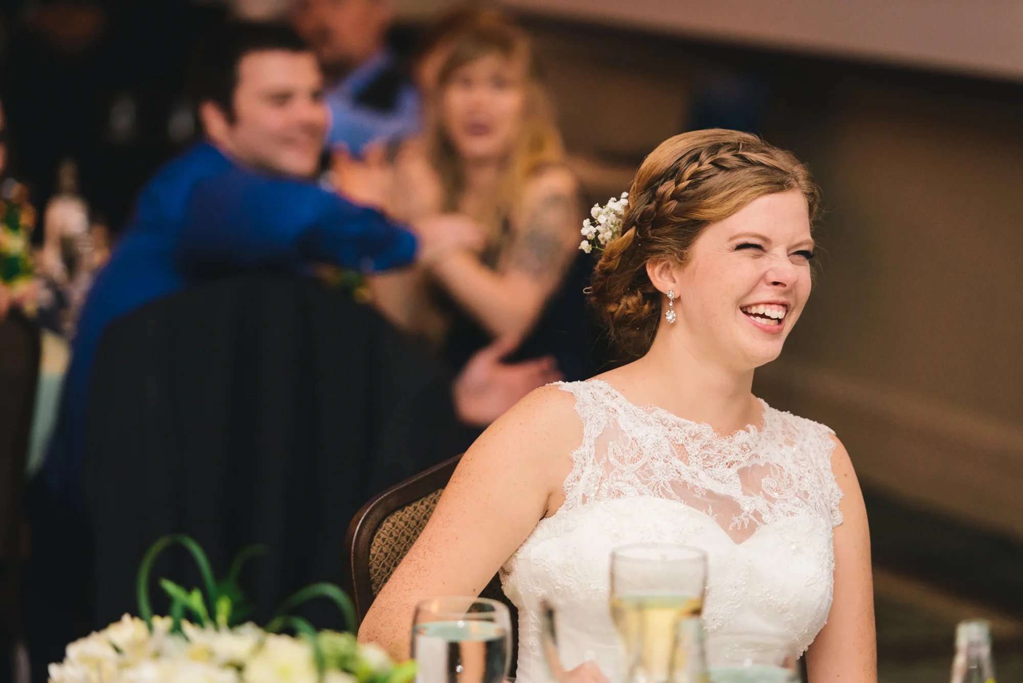 Smiling bride in white lace dress sitting at a reception with guests in the background.