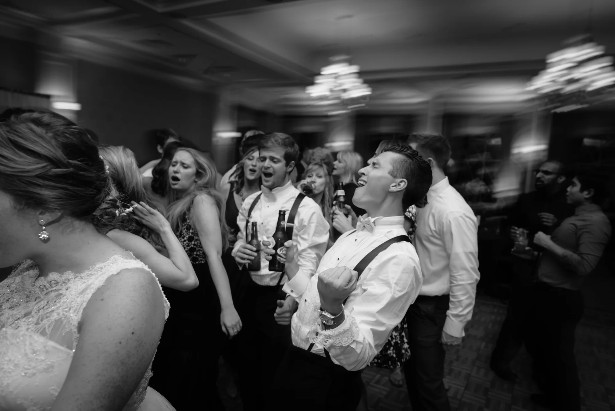 Group of people dancing and singing at a party, wearing formal attire, in a dimly lit room.