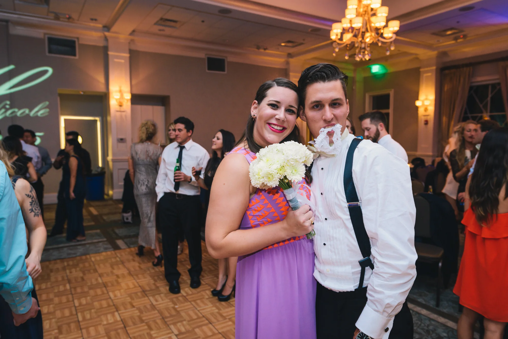 Couple at a wedding reception, woman holding bouquet, man with a garter, formal attire, people dancing in the background.