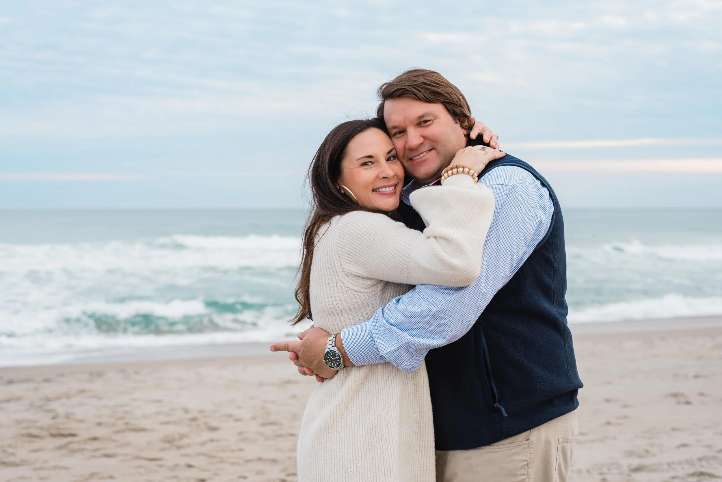 Couple embracing on a beach, smiling with ocean waves in the background.