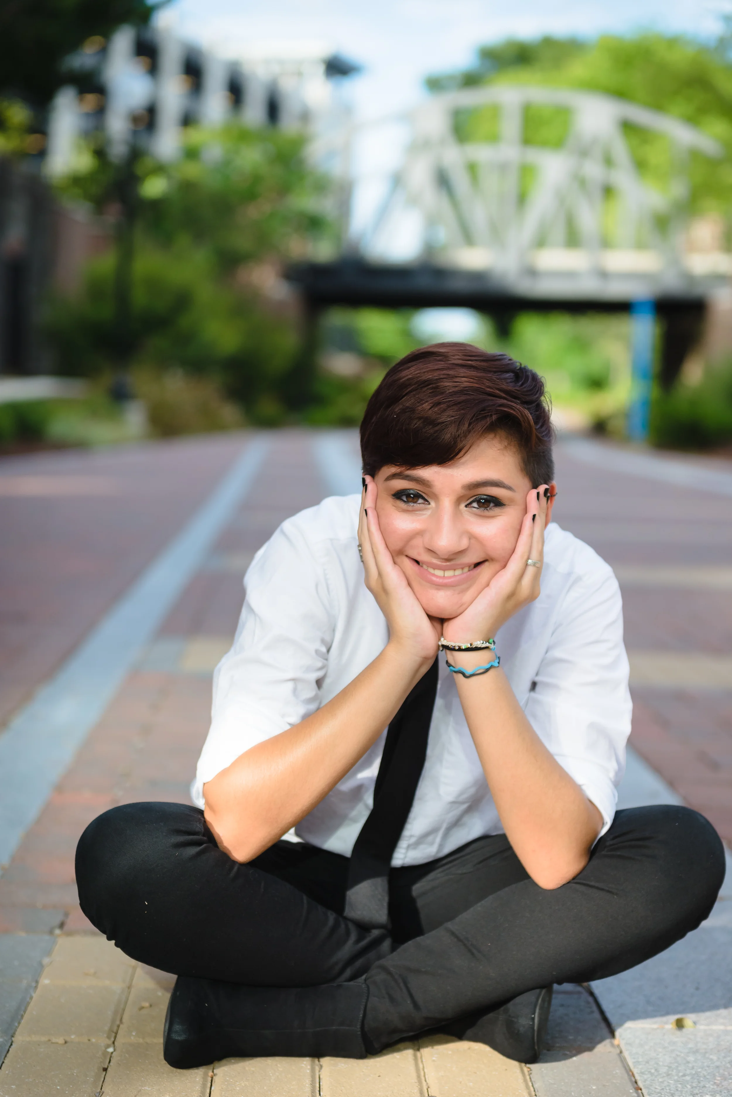 Person sitting cross-legged on a brick path, wearing a white shirt and black pants, smiling with chin resting on hands, with a blurred bridge in the background.