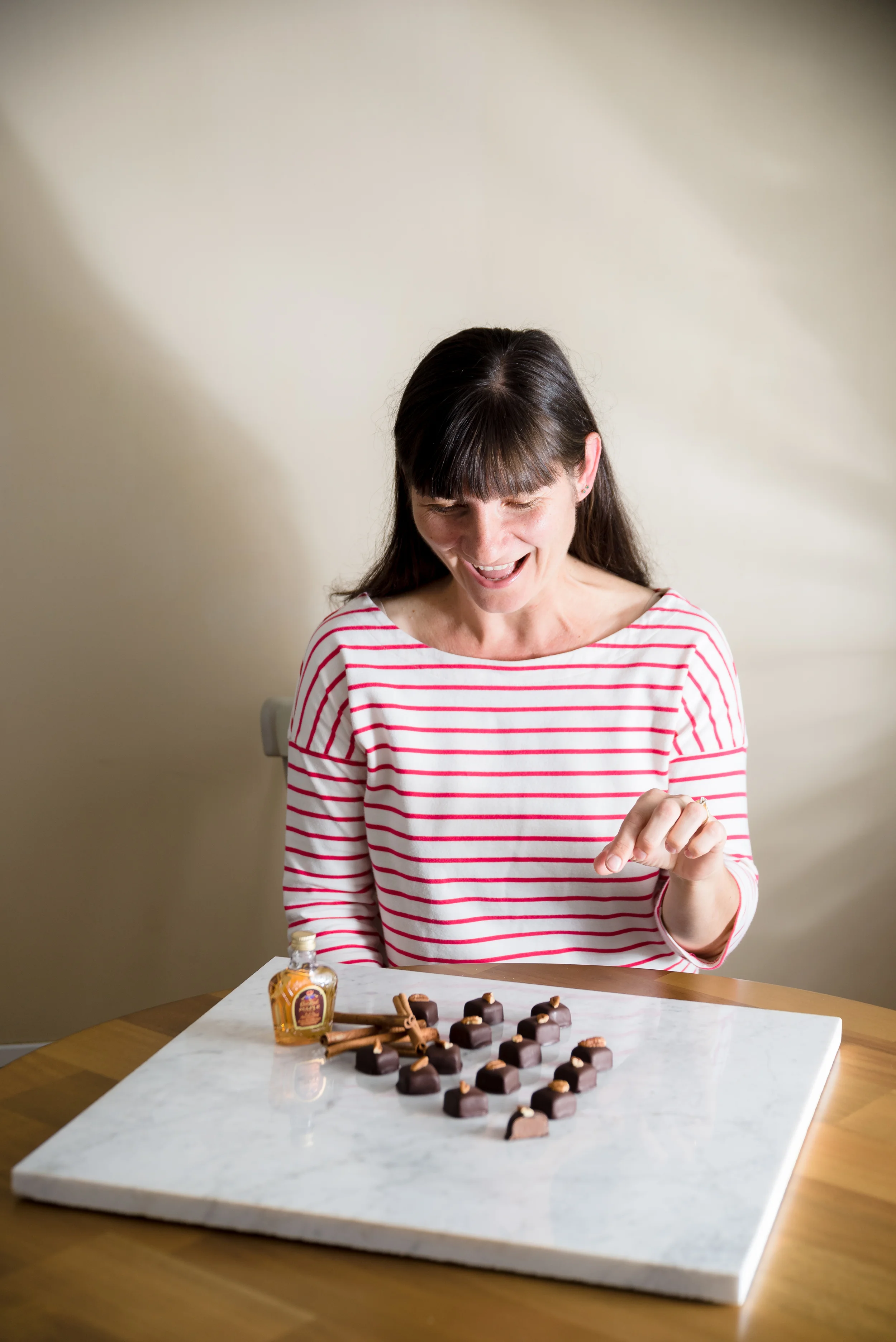 Woman in a striped shirt smiling while pointing at a marble tray of chocolates on a table, with a small bottle and cinnamon sticks nearby.