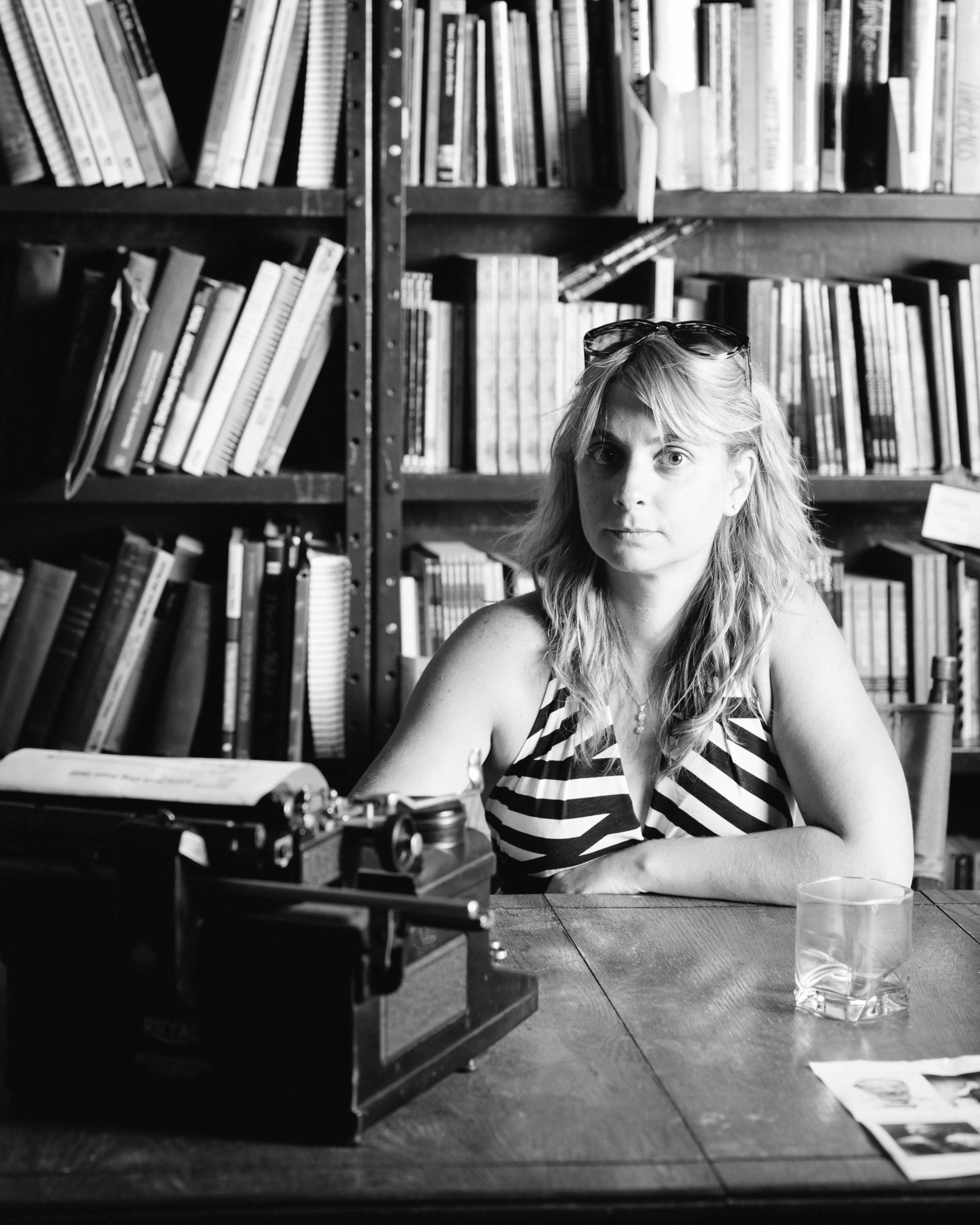Black and white photo of a woman sitting at a table in a library with bookshelves in the background, a typewriter, and a glass on the table.