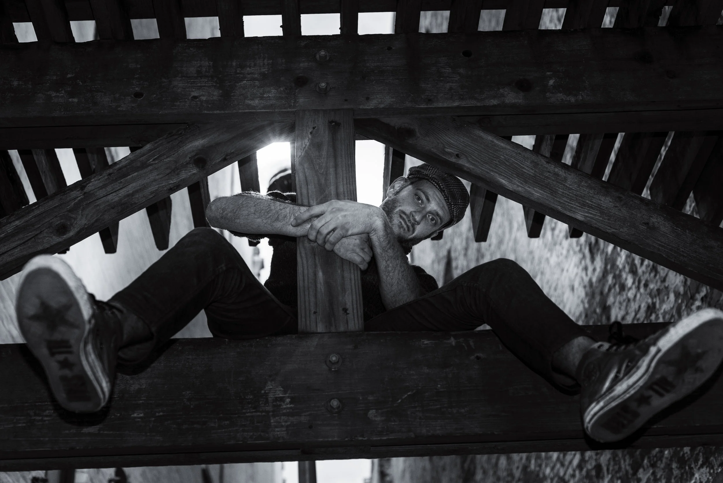 Black and white image of a man wearing a cap sitting under a wooden structure. View fullsize