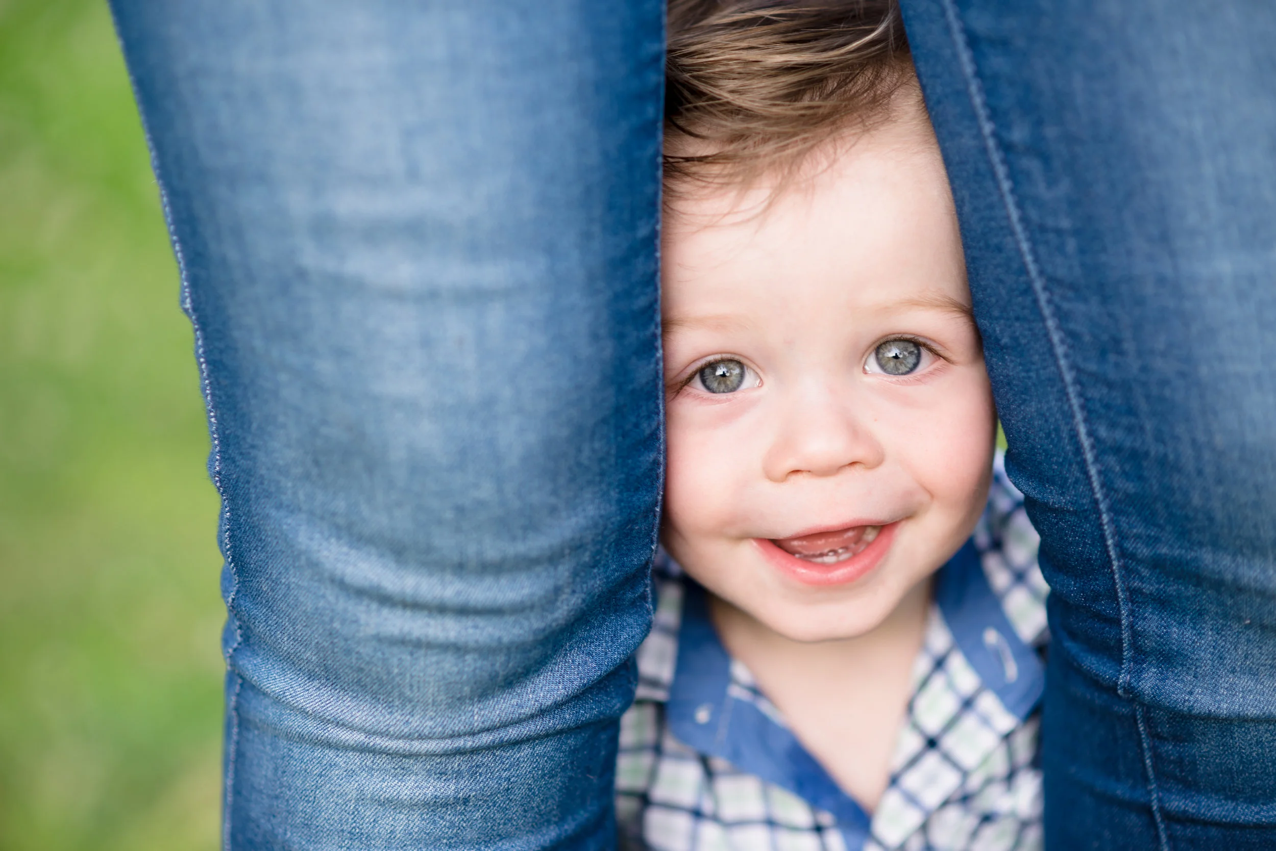 Child peeking between adult's legs in jeans outdoors. View fullsize
