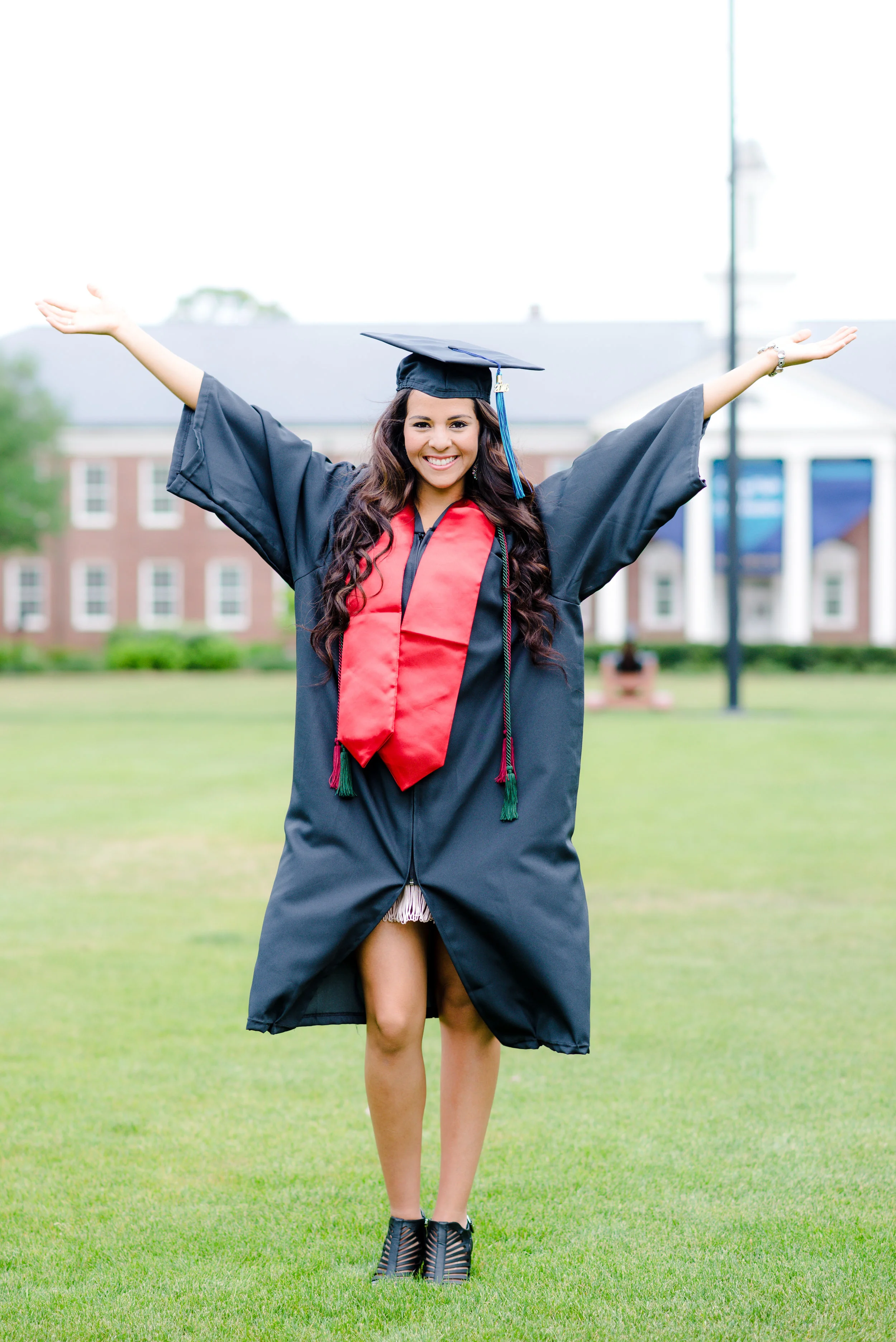 Smiling graduate in cap and gown with arms raised, standing on grass, brick building in background