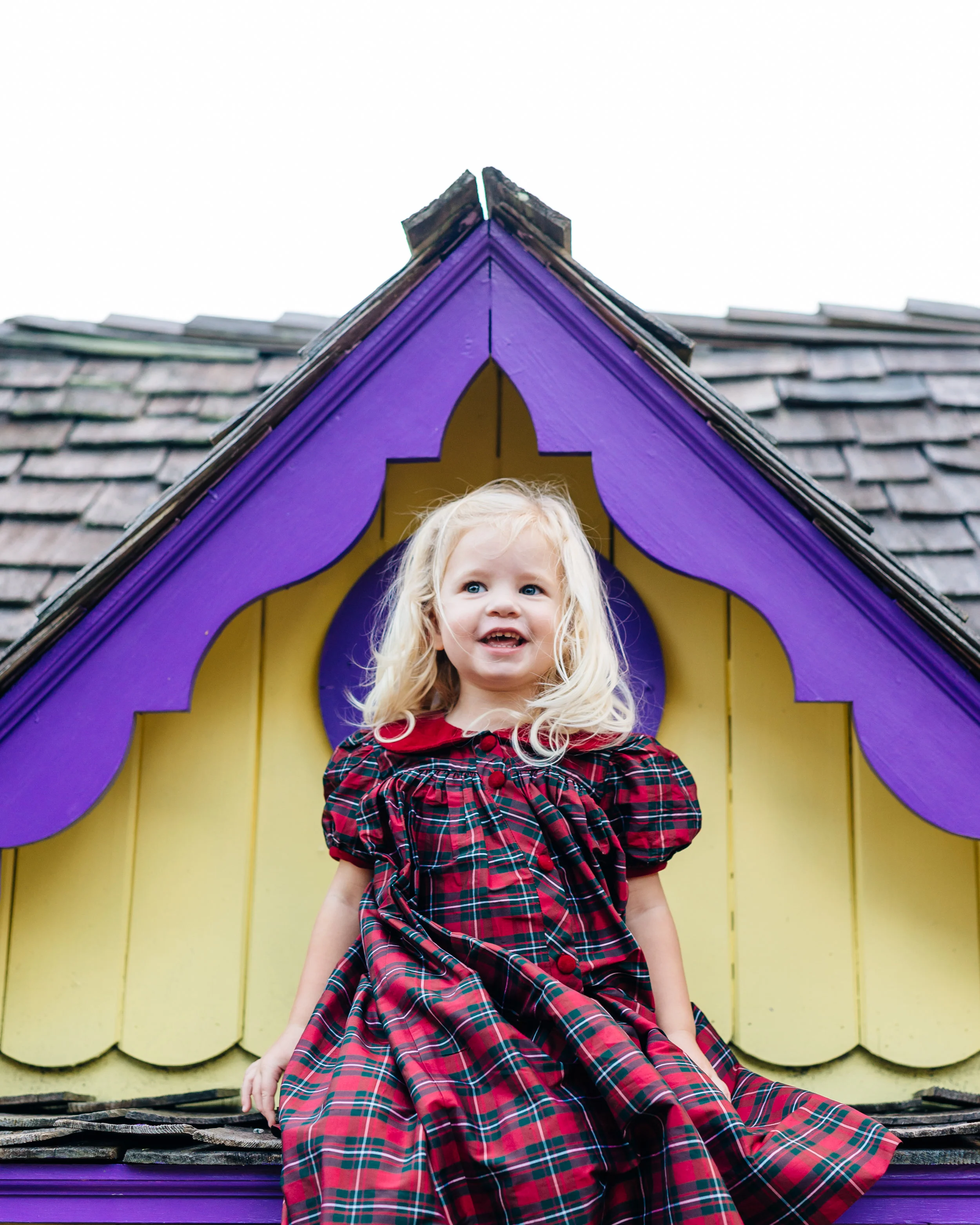 Young girl in a red plaid dress sitting on a colorful wooden structure with a purple and yellow gabled roof.