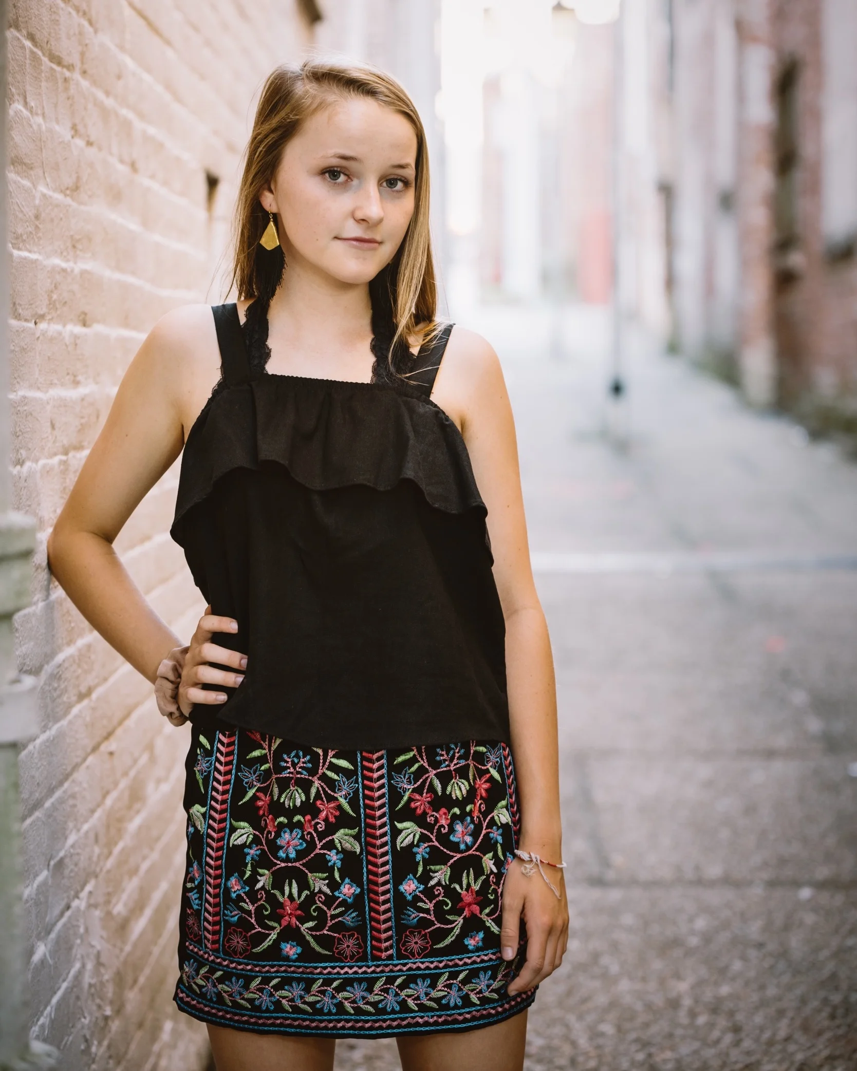 Young woman standing in an alley, wearing a black top and a floral-patterned skirt.