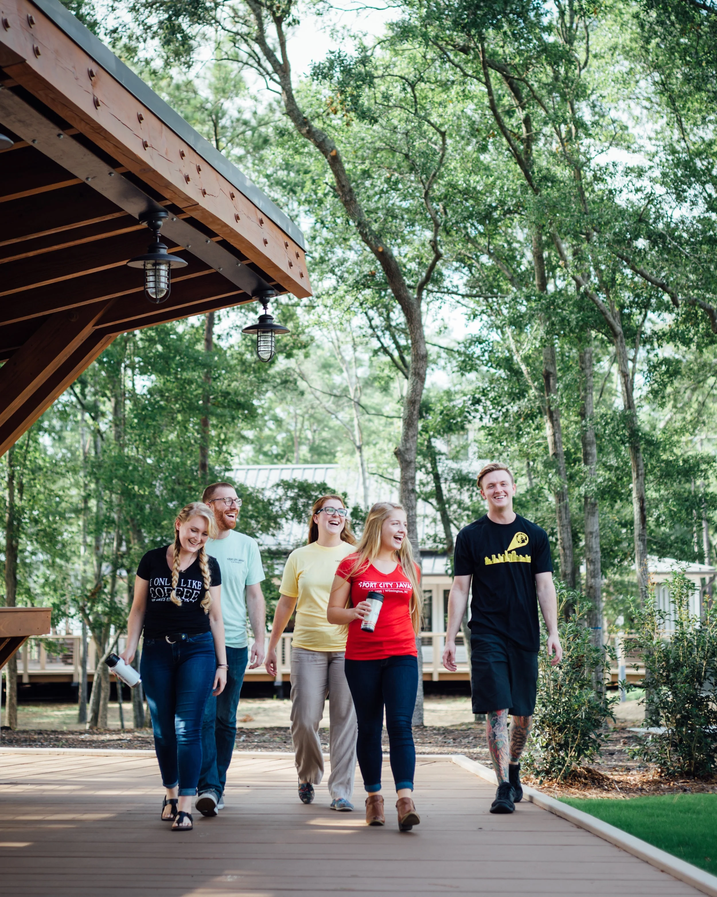 Group of young adults casually walking and smiling in an outdoor wooded area with patio and greenery.