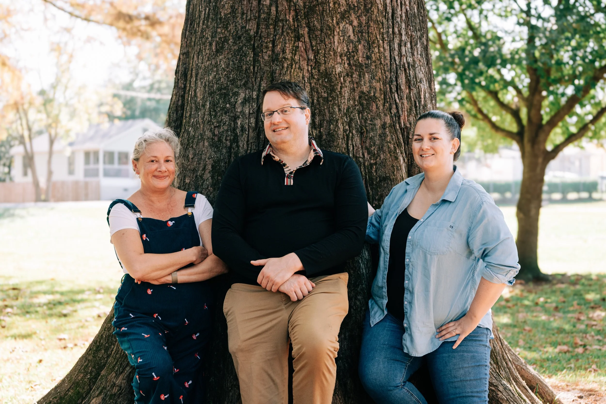 Three people, two women and a man, leaning against a large tree in a park setting. They are smiling and dressed casually. There is grass and other trees in the background.