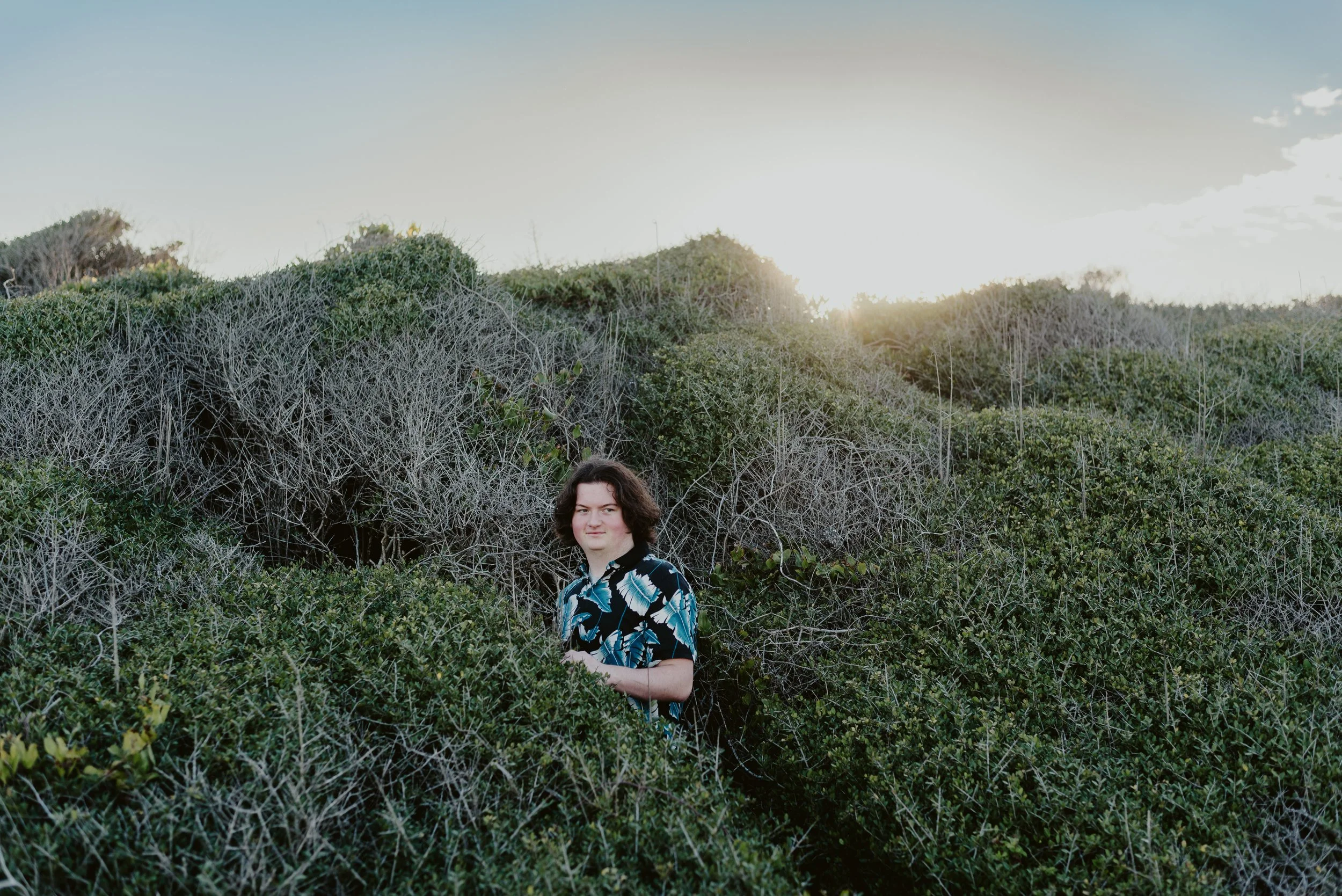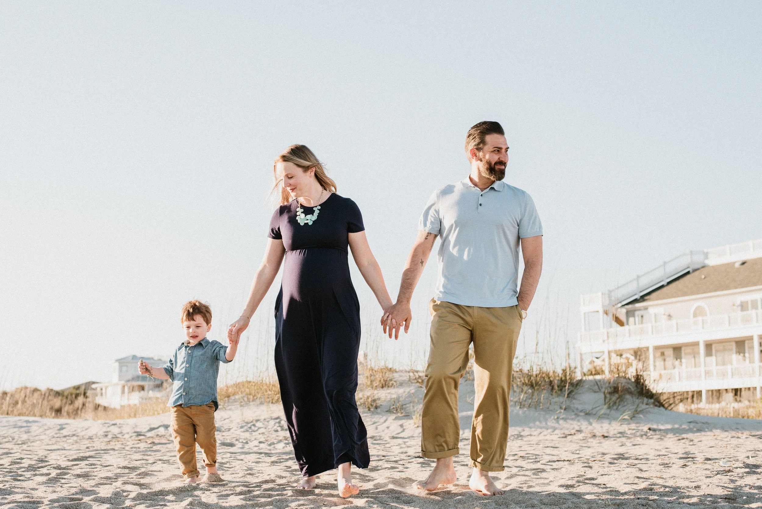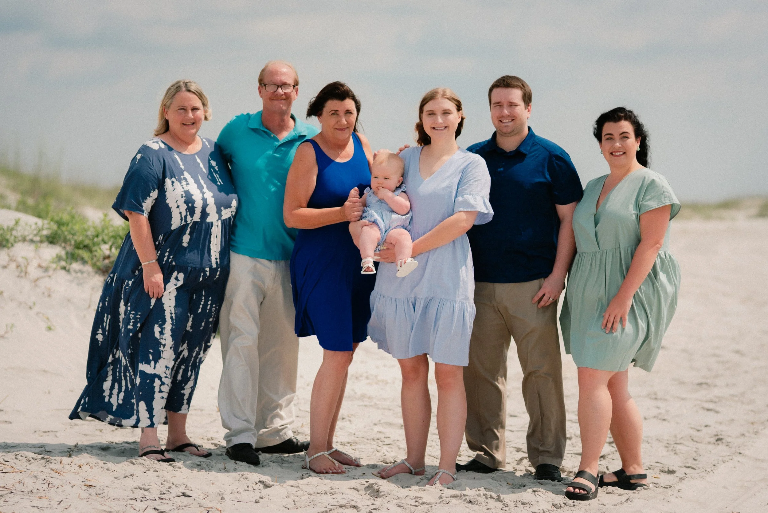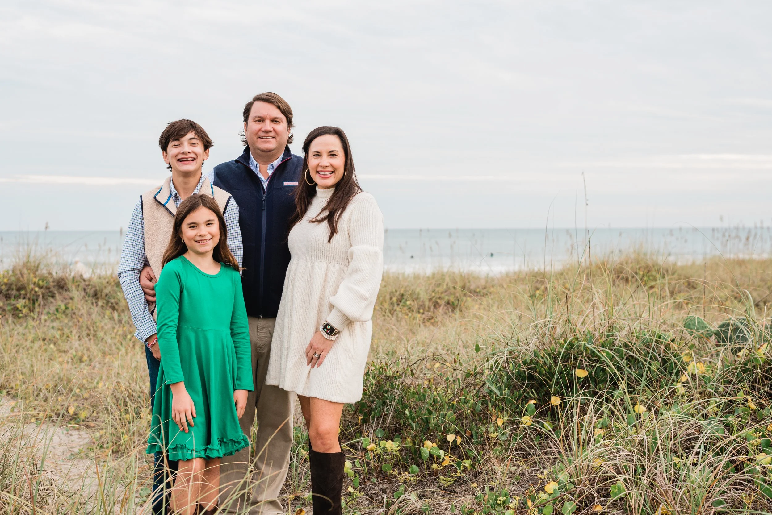 Family photo with four people, including a man, woman, boy, and girl, standing in front of a grassy dune with the ocean in the background.