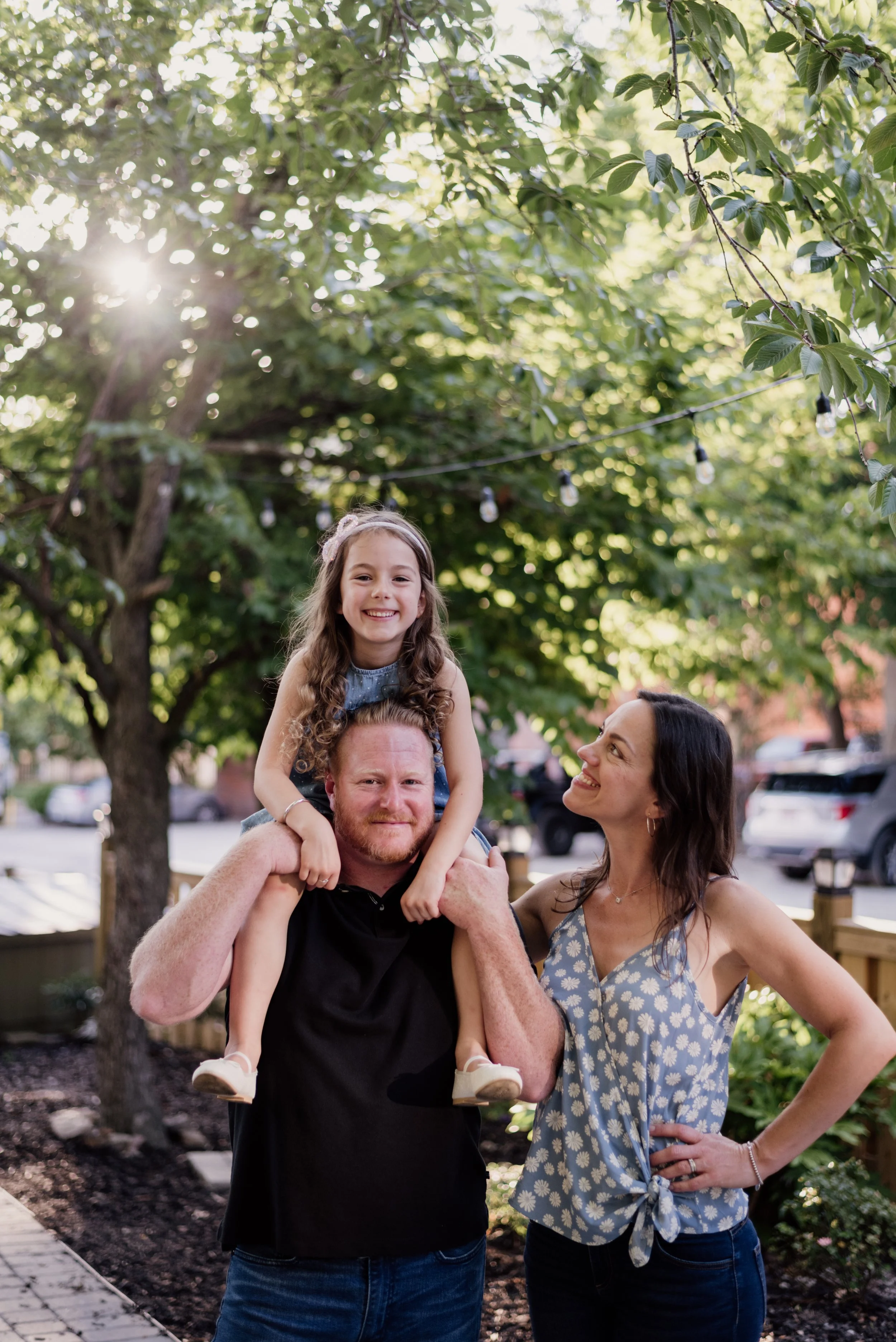 A man holding a young girl on his shoulders, with a woman standing beside them in a garden setting. The man is wearing a black shirt, the girl is smiling, and the woman is looking at them. Trees and hanging lights are in the background. View fullsize