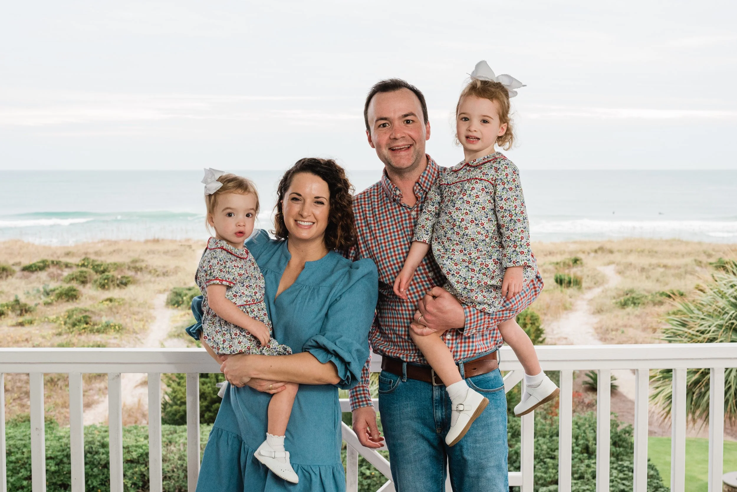 Family of four posing on a porch overlooking the beach, with two young children in matching dresses and parents smiling, surrounded by coastal landscape.