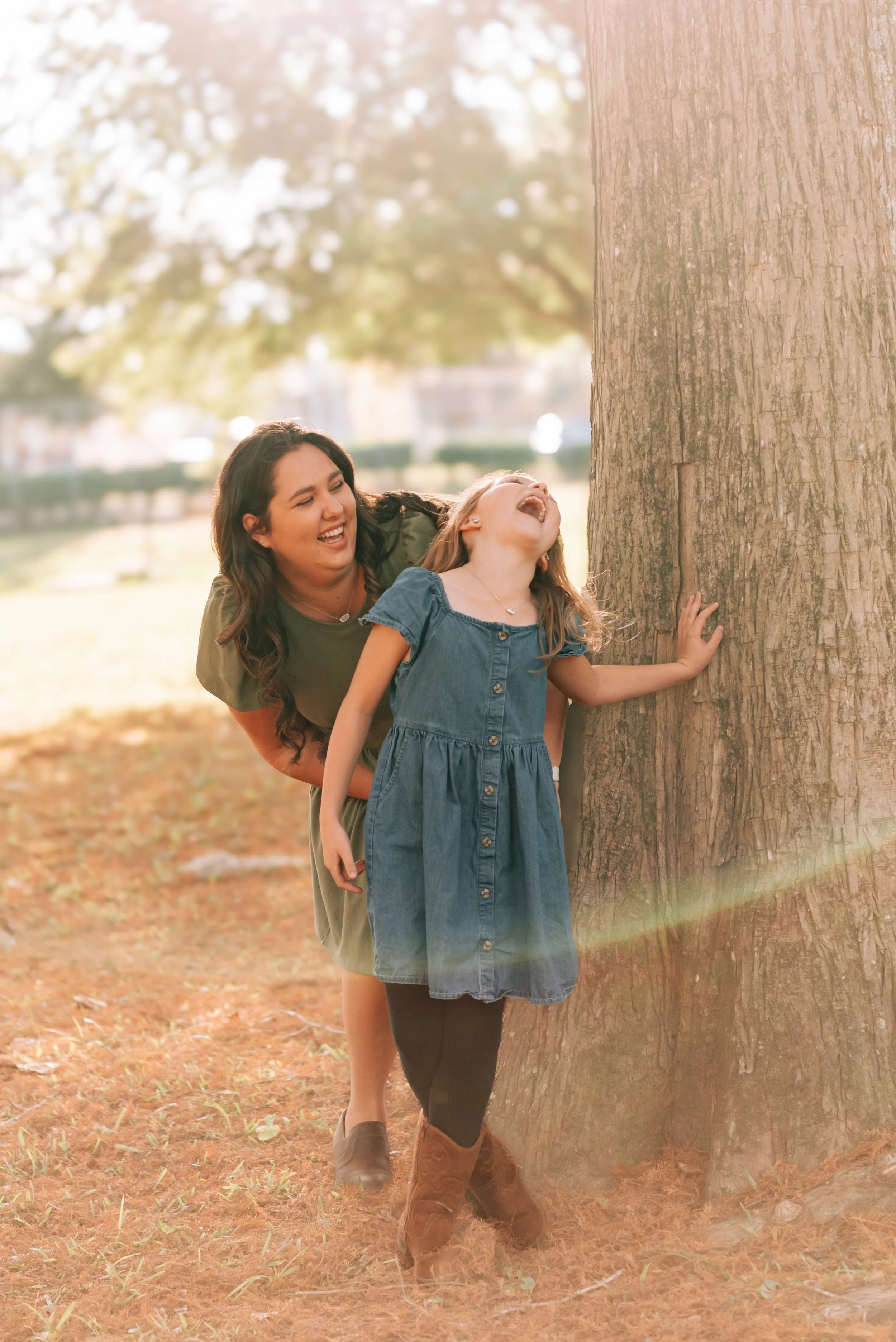 A woman and young girl laughing near a tree in a park, with sunlight filtering through the leaves.