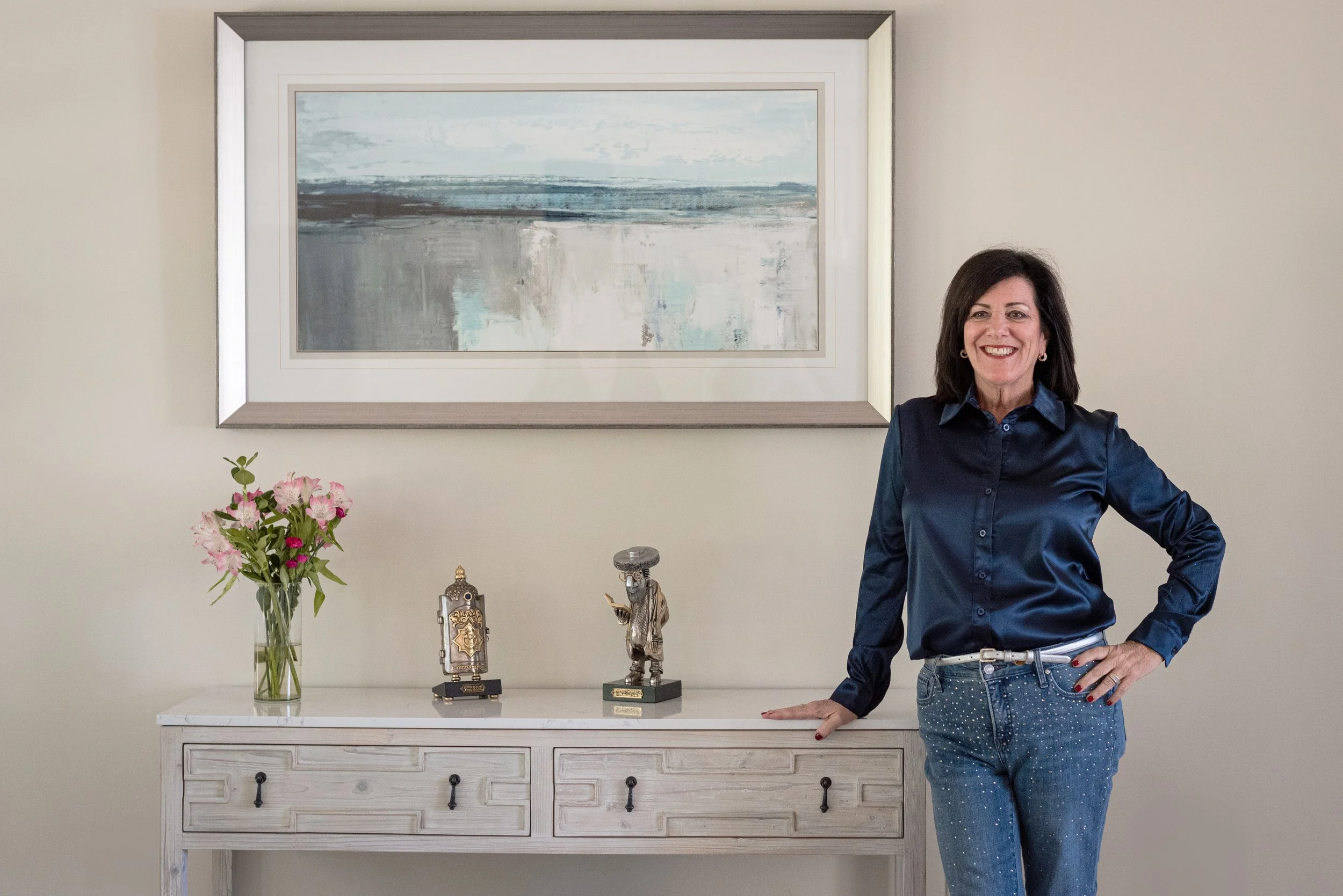 Woman in blue blouse standing next to a white console table with pink flowers and statues, with abstract artwork on the wall.