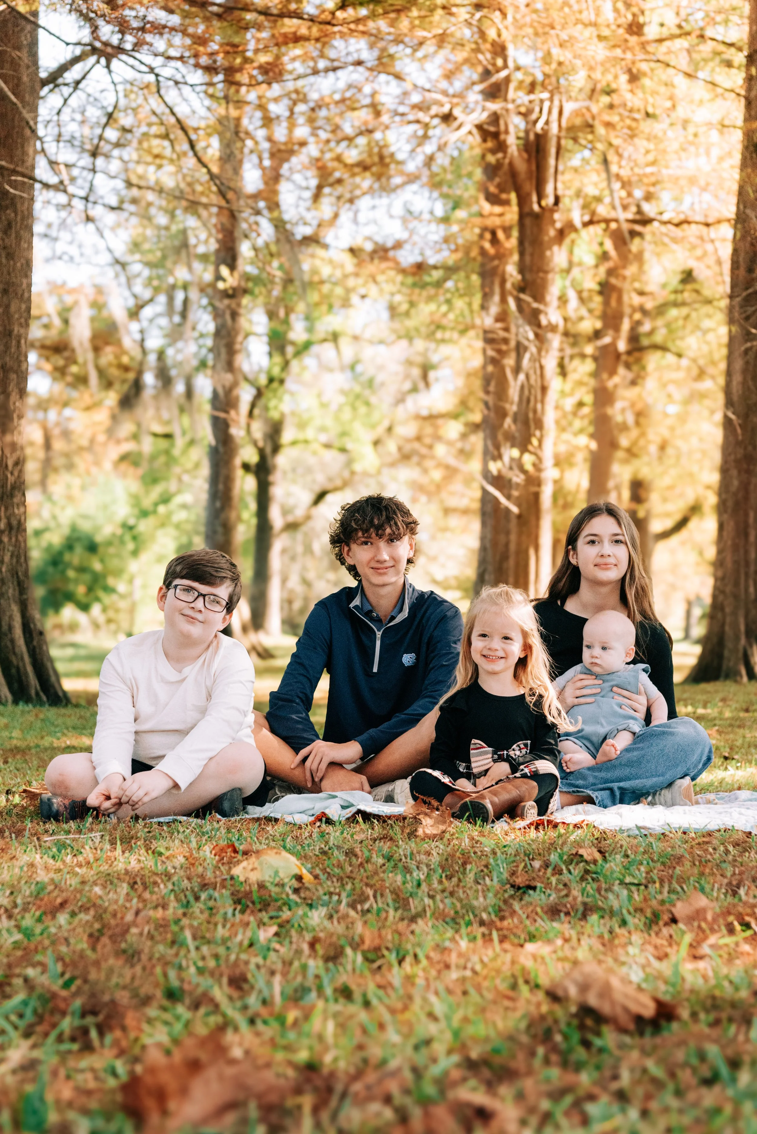 Five children sitting on a blanket outdoors in a park during autumn, surrounded by trees with colorful fall leaves. View fullsize