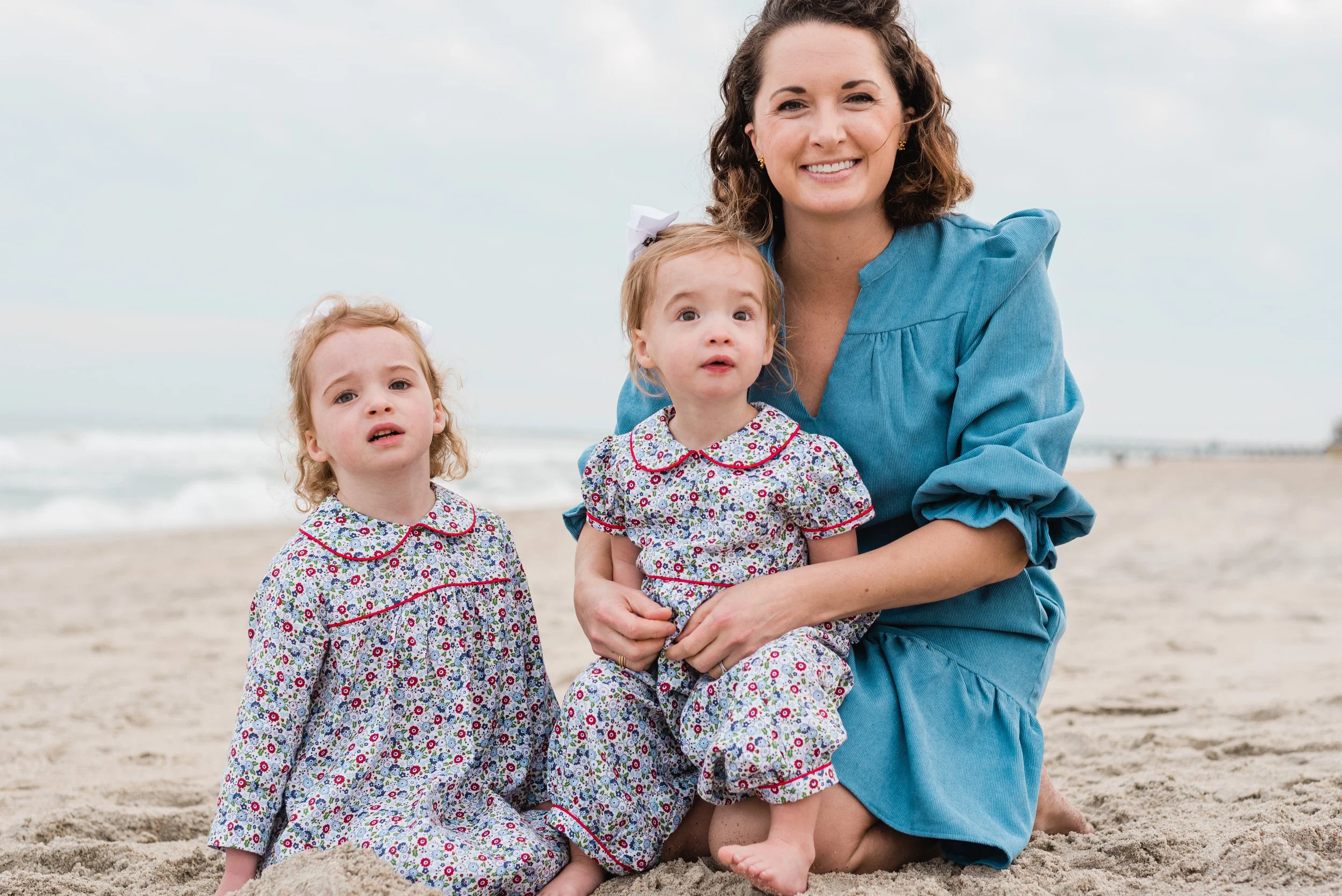 Woman with two young children sitting on the beach, smiling. View fullsize