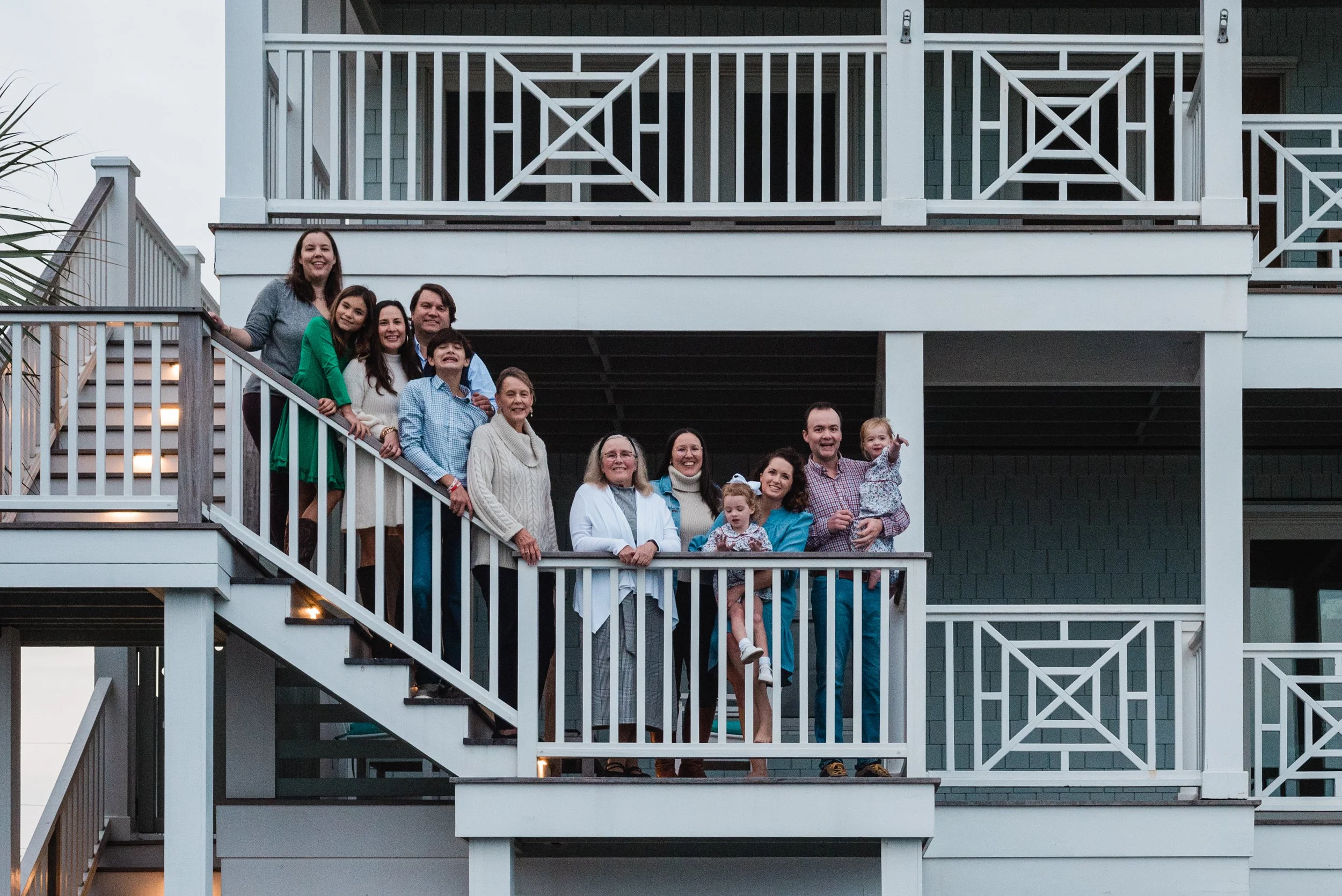Group of people posing on a multi-level porch staircase, smiling towards the camera.