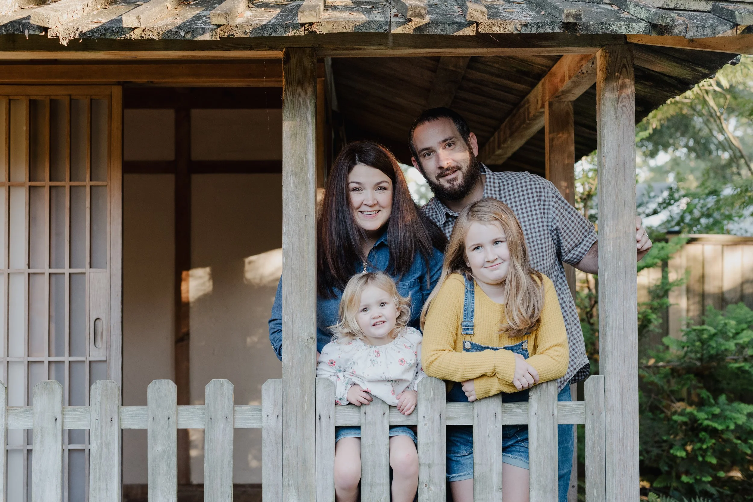 Family of four standing on a wooden bridge in a park wearing casual attire, surrounded by autumn trees. View fullsize