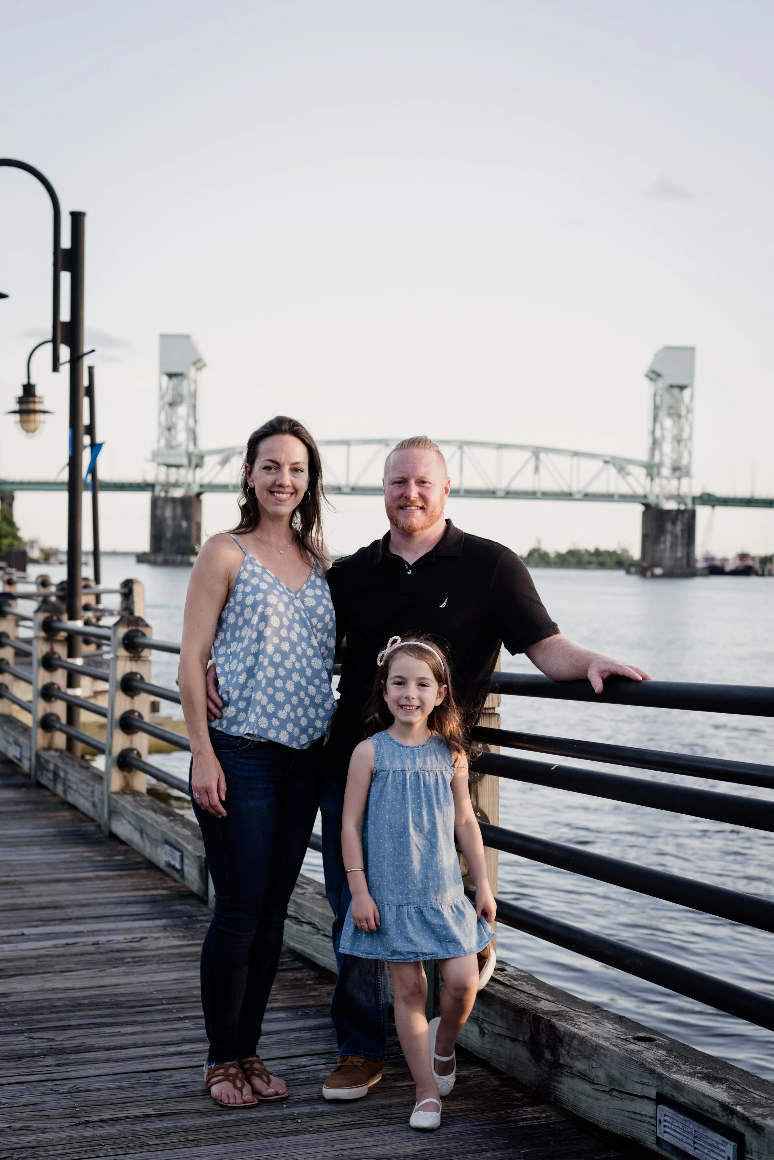 Family posing on a boardwalk near a river with a bridge in the background. View fullsize