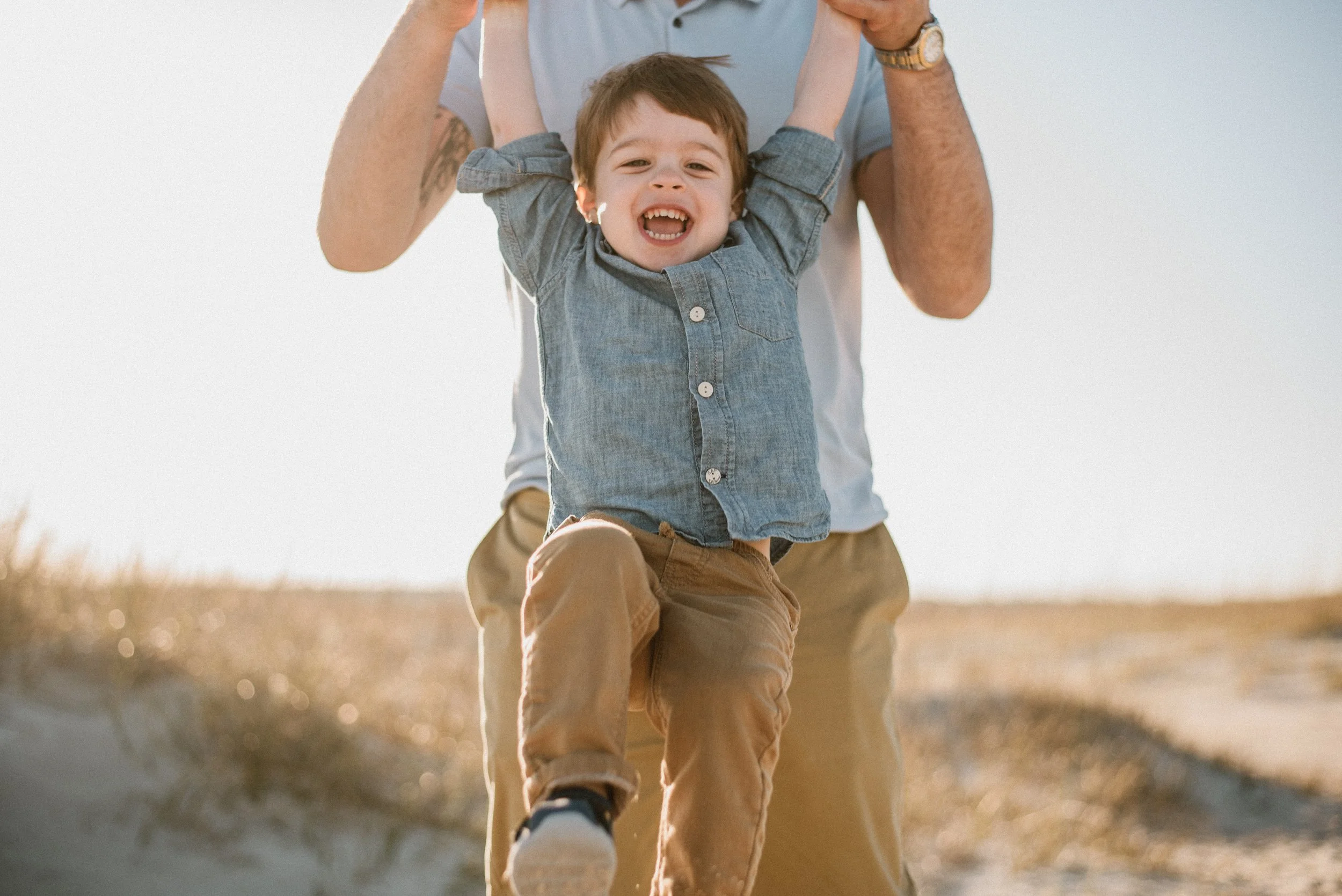 Child being lifted in the air by an adult on a sandy beach, both smiling.