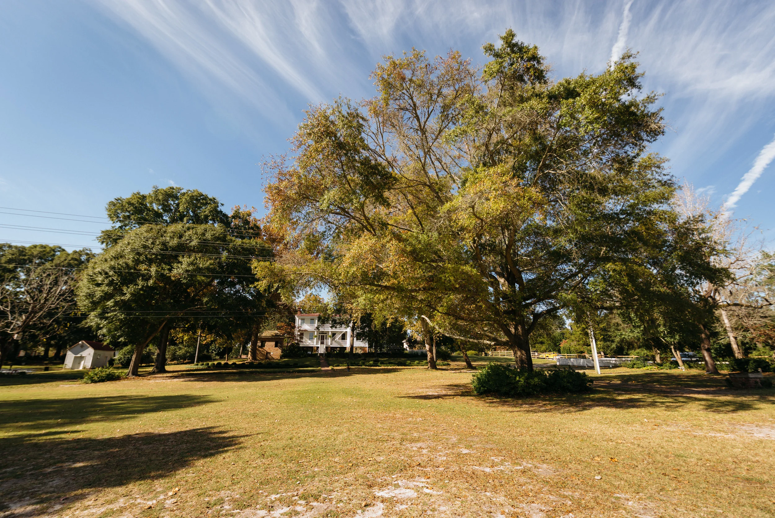 Large tree in a grassy area with a white house and small white building in the background under a blue sky. View fullsize