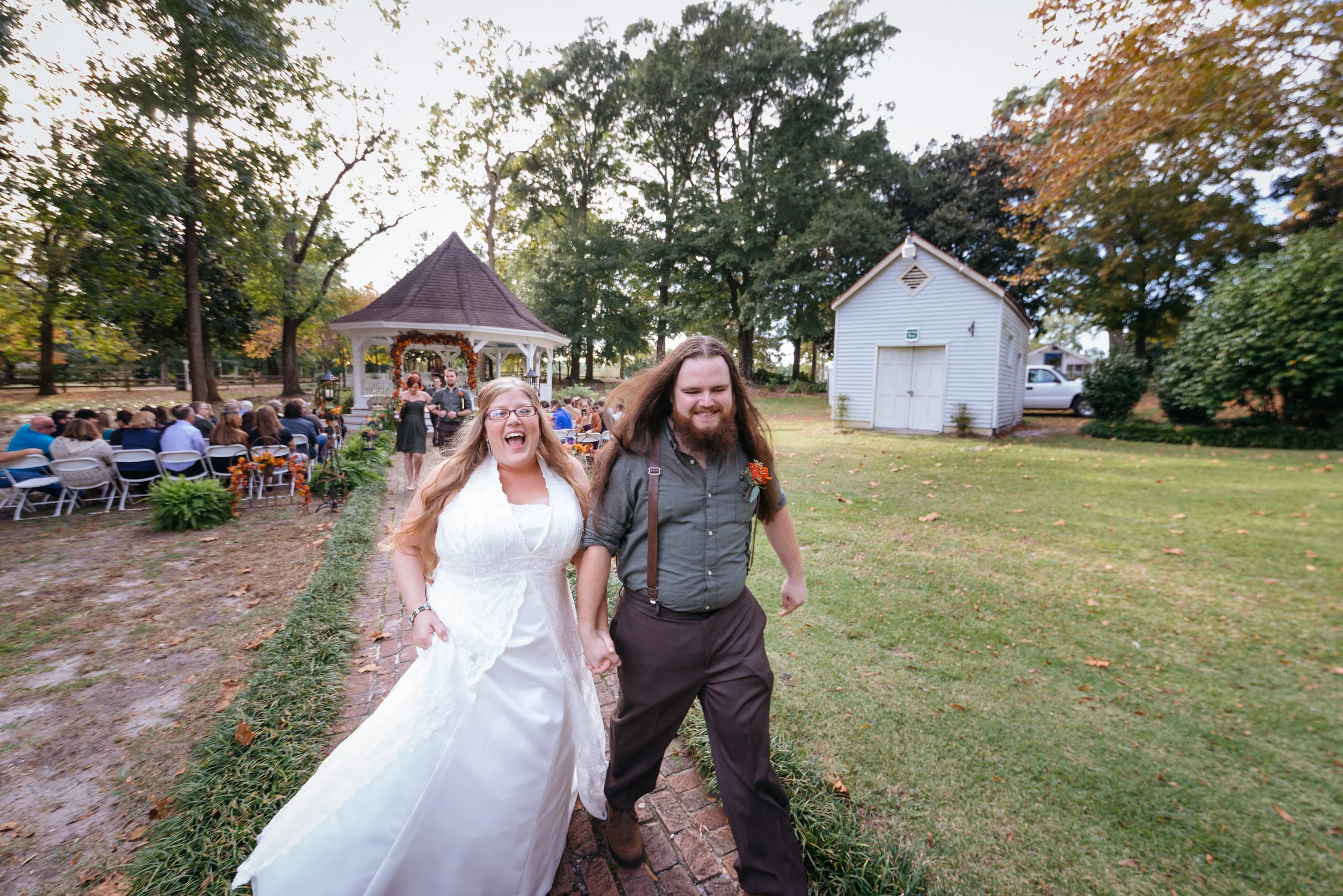 A joyful couple walking hand-in-hand down a path during an outdoor wedding ceremony. The bride is in a white dress, and the groom is in a casual shirt and pants with suspenders. Guests are seated near a gazebo decorated with flowers. View fullsize