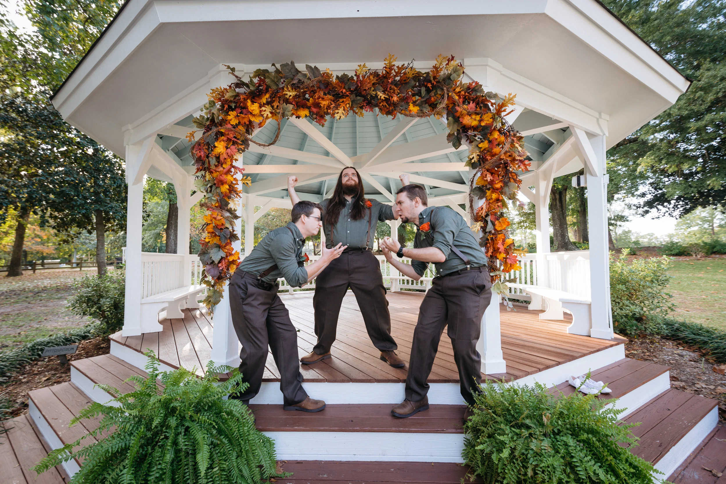 Three men posing playfully under a gazebo decorated with autumn leaves and flowers.