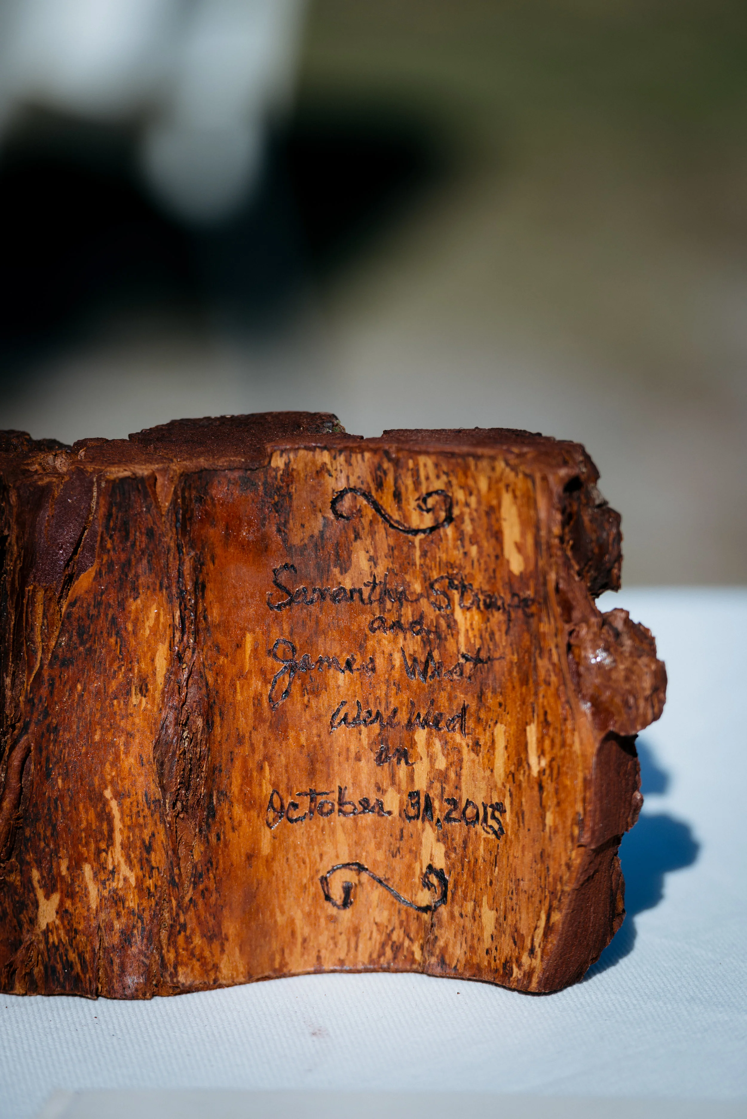 A wooden plaque with engraved text.