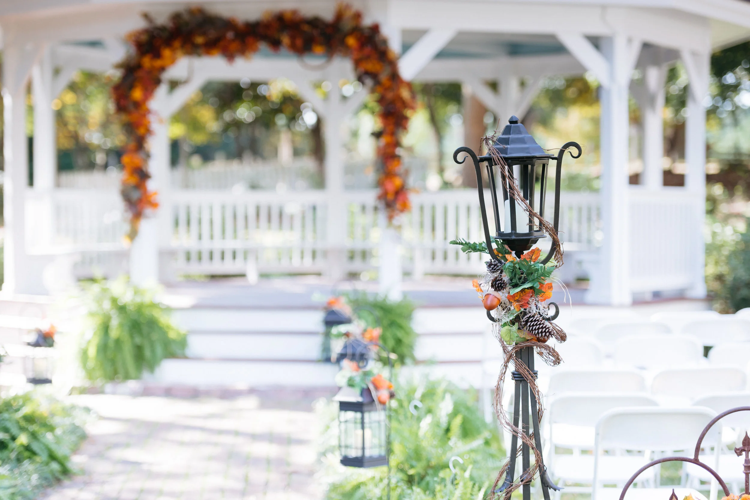 Gazebo decorated for outdoor wedding with autumn leaves and lanterns.